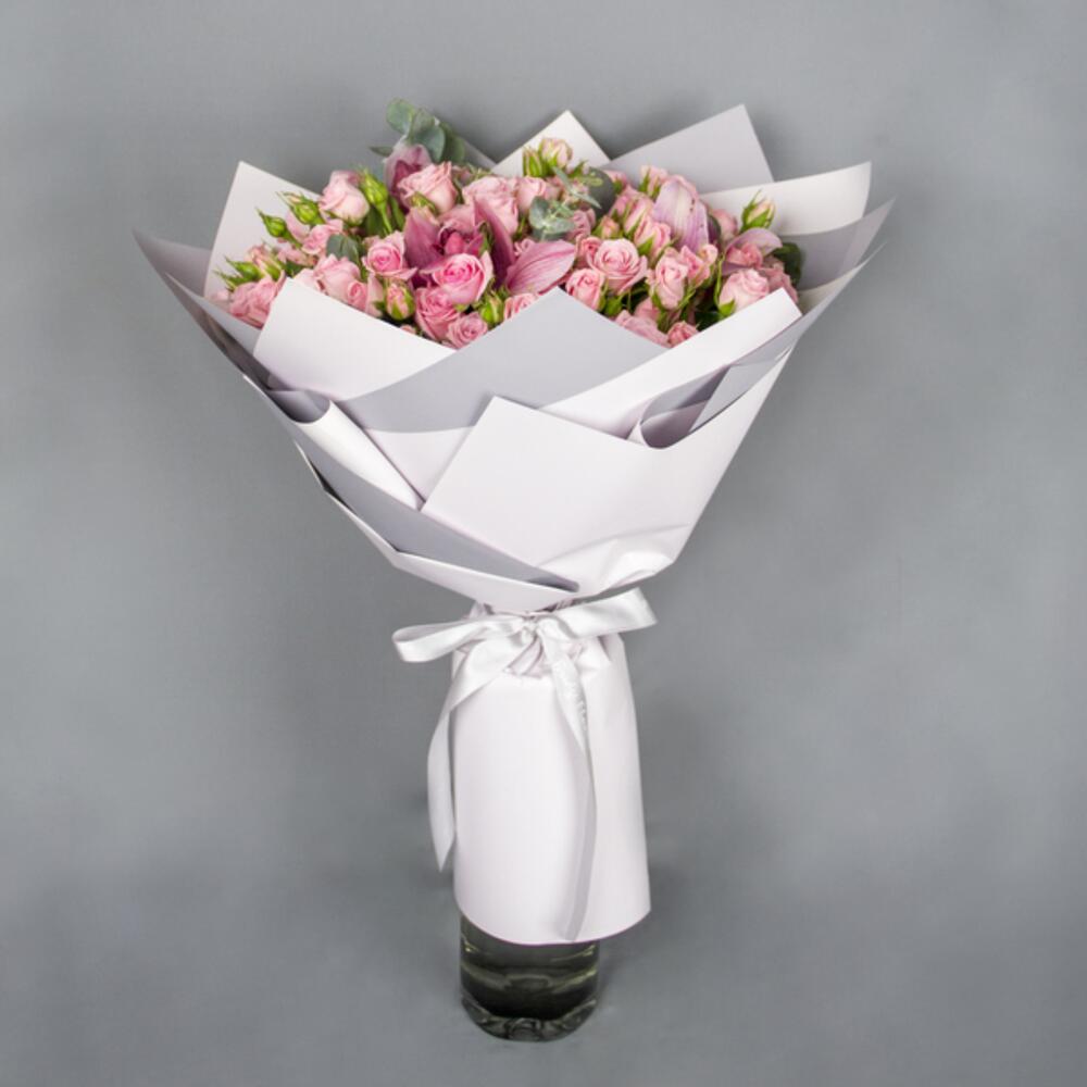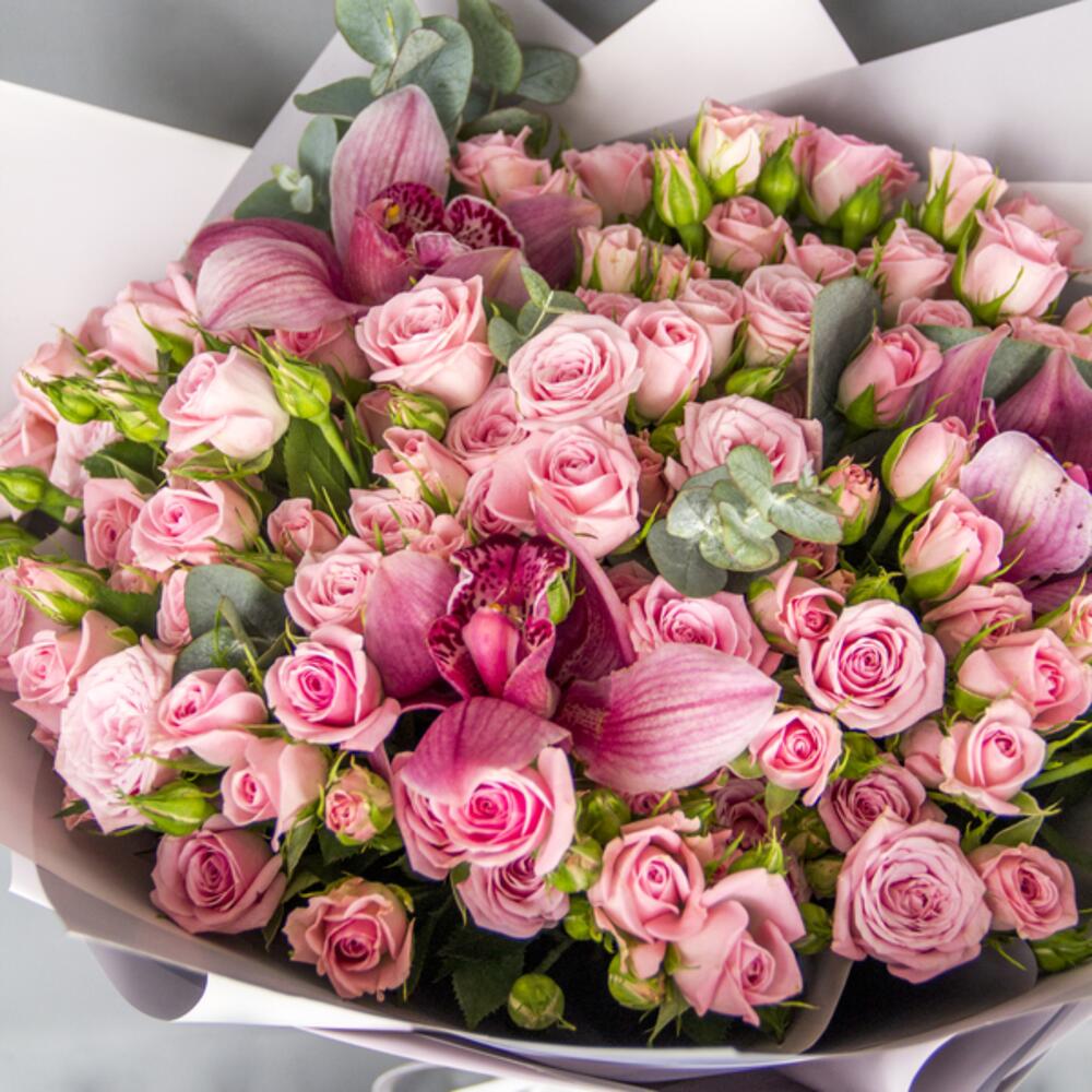 A hand bouquet of pink spray roses and pink cymbidium orchids with eucalyptus leaves