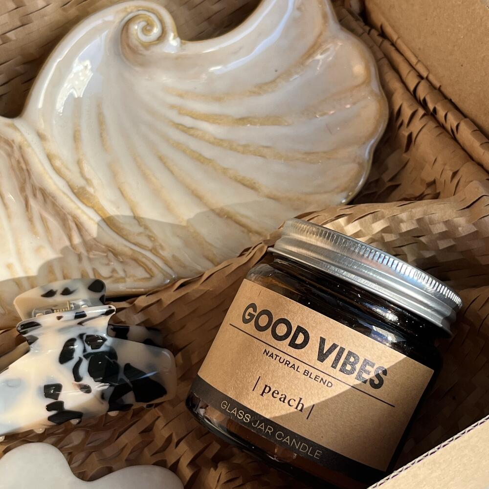 ceramic decorarive dish - 1 un. stone gua sha scraper - 1 un. hand soap - 1 un. hair claw clip - 1 un. candle in a glass - 1 un. massage soap - 1 un.