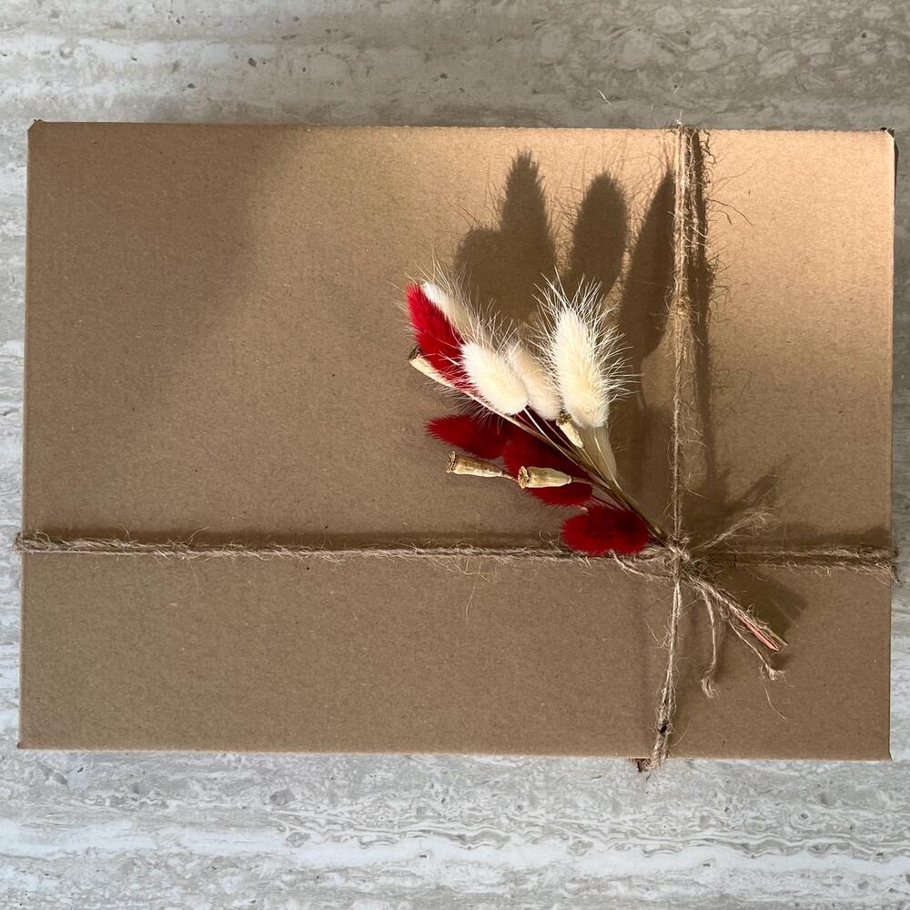 The set includes: • A ceramic decorative dish • A stone gua sha scraper • Handmade hand soap with the scent of cleanliness and freshly washed linen, 100 g • Handmade massage shower soap with cinnabon scent, 100 g • Hair claw clip The set is carefully wrapped in kraft paper and a box, decorated with dried flowers.