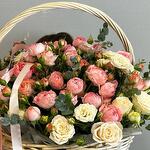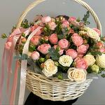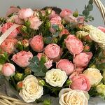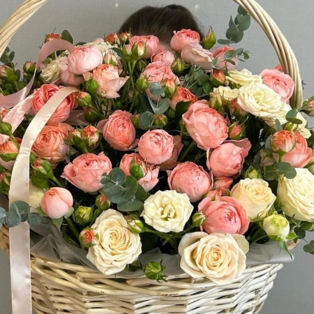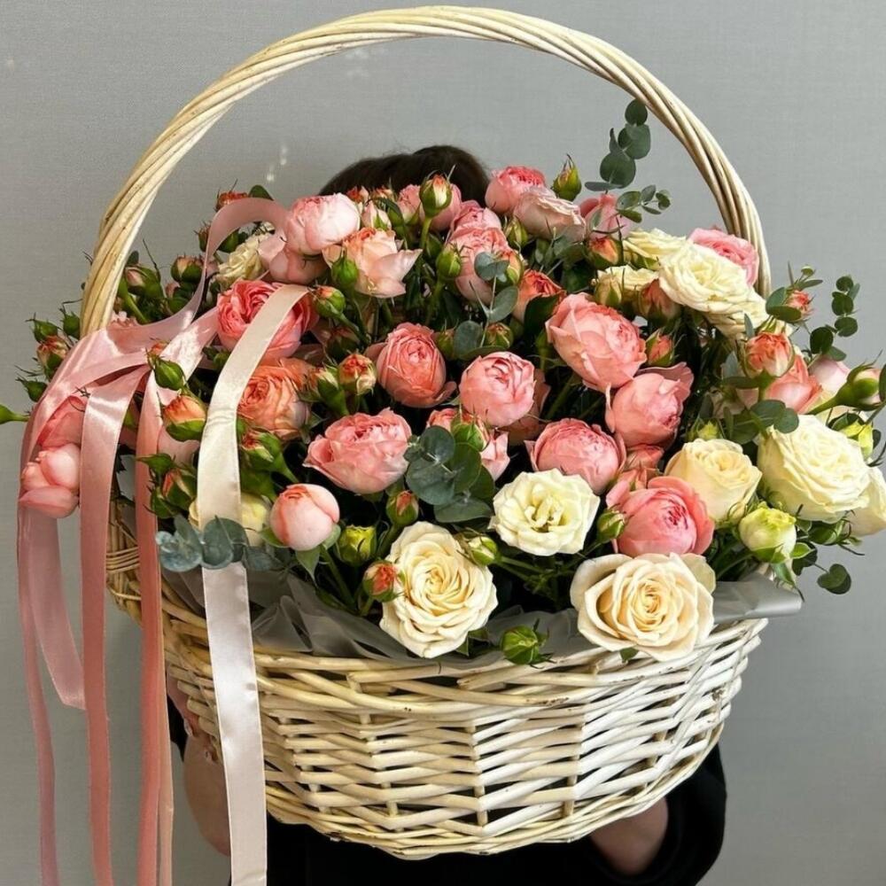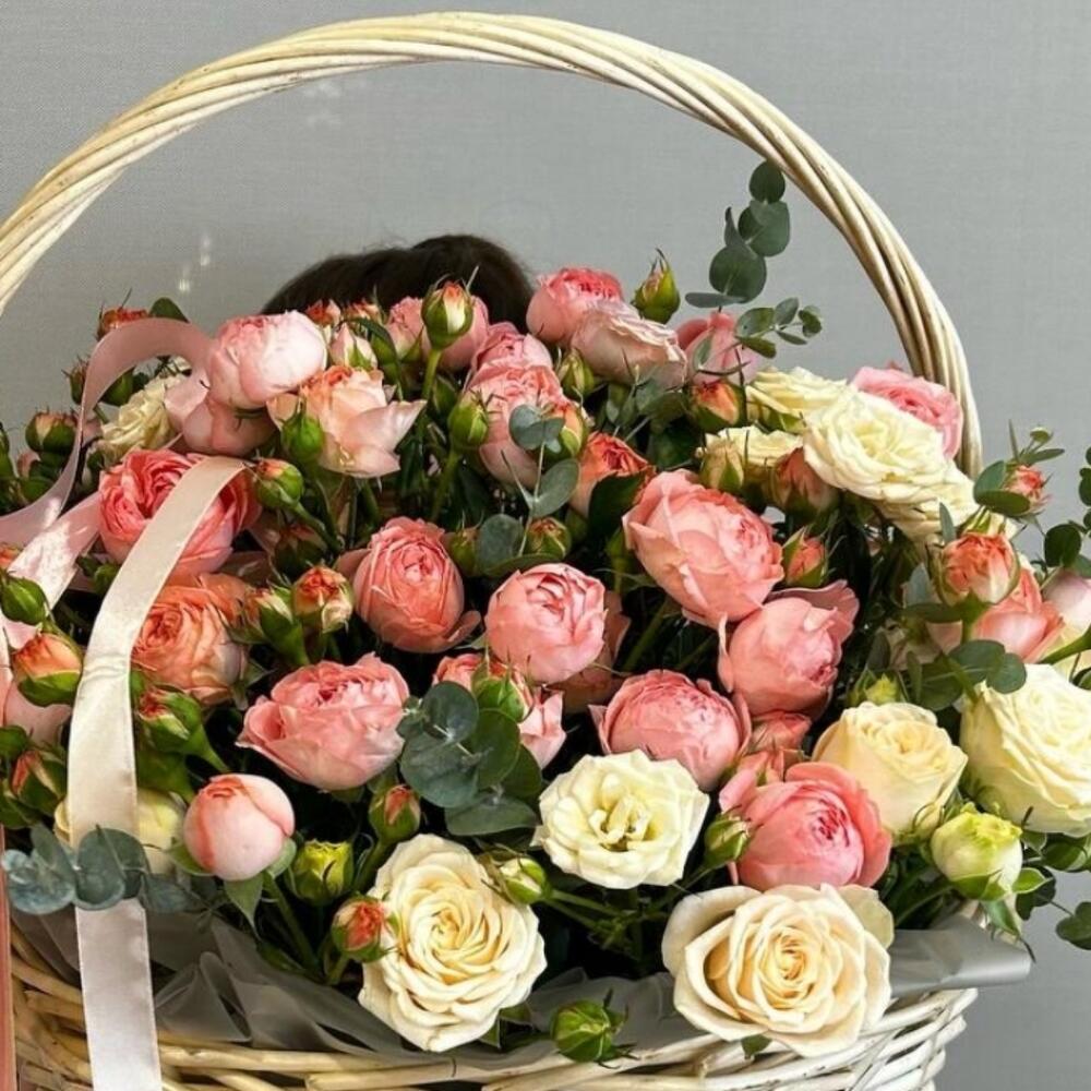 Шикарная корзина с кустовыми пионовидными розами Бомбастик и ароматным эвкалиптом
