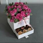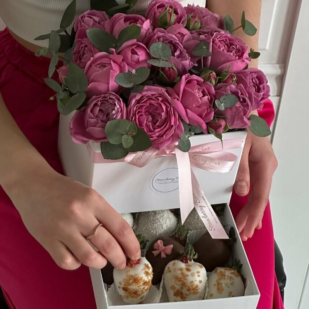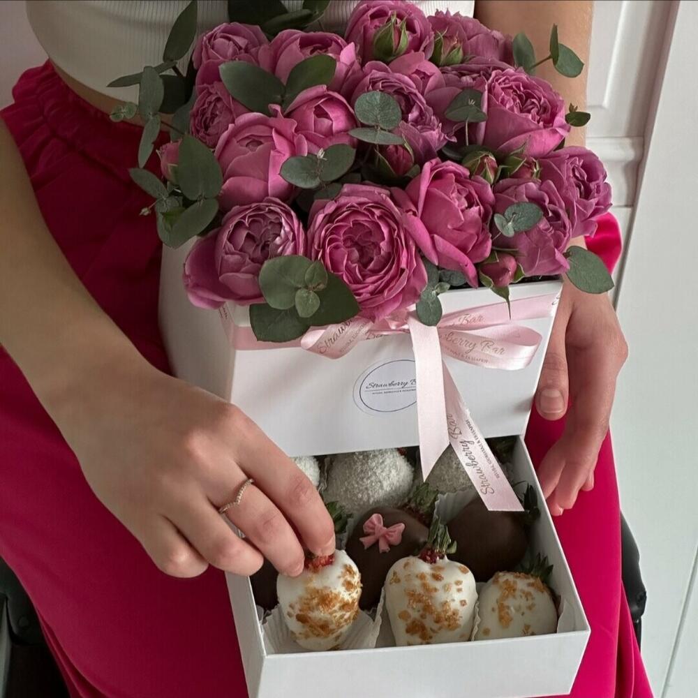 Самый лучший подарок 2 в 1. Коробка с цветами в виде шкатулки, наполненной клубникой в шоколаде. Универсальный подарок, который отлично подойдет и дорогому, любимому человеку, маме, бабушке, сестре, коллеге. Шкатулка оформлена кустовыми розами. Сорт роз может подлежать изменению по согласованию с заказчиком. Также может рассмотреть вариант оформления другими цветами из каталога магазина по согласованию. Свяжитесь по этому поводу через кнопку «написать» до оформления заказа.❤️