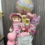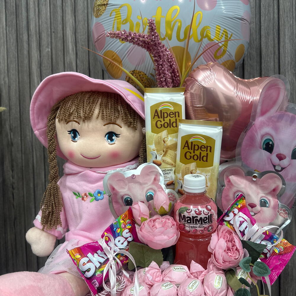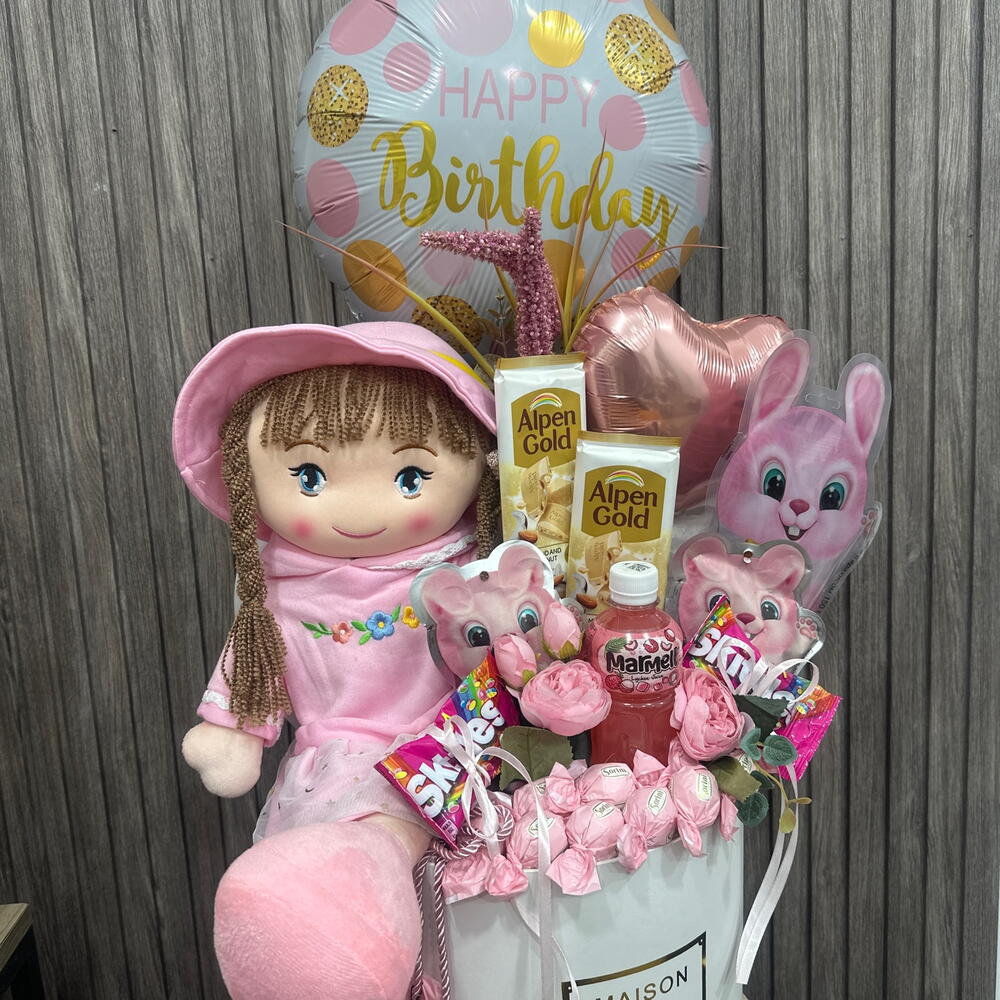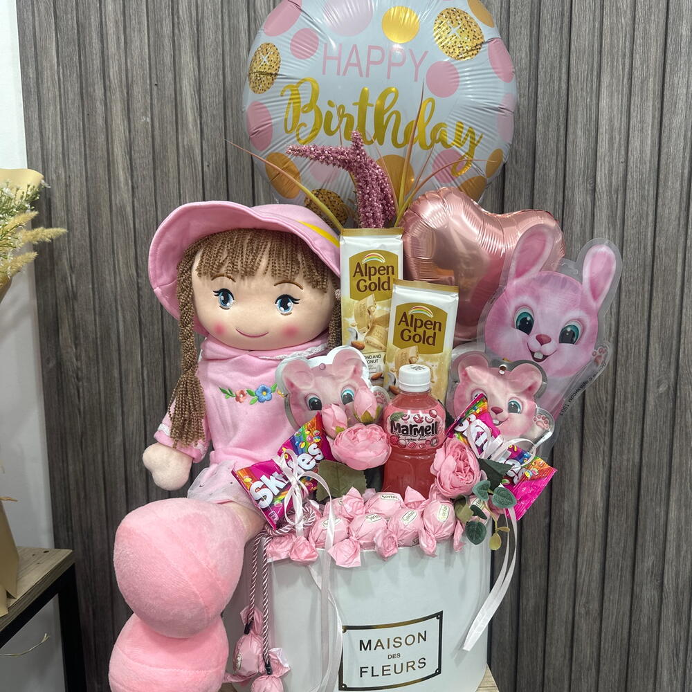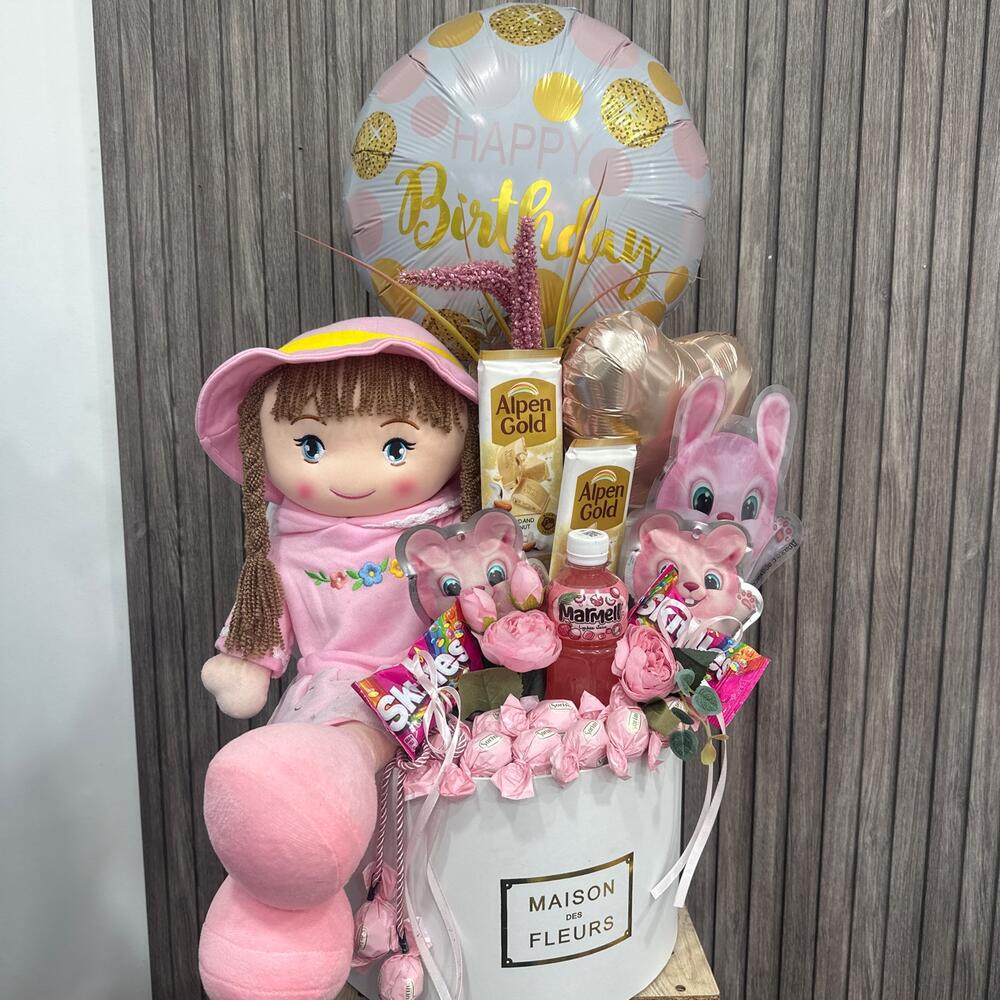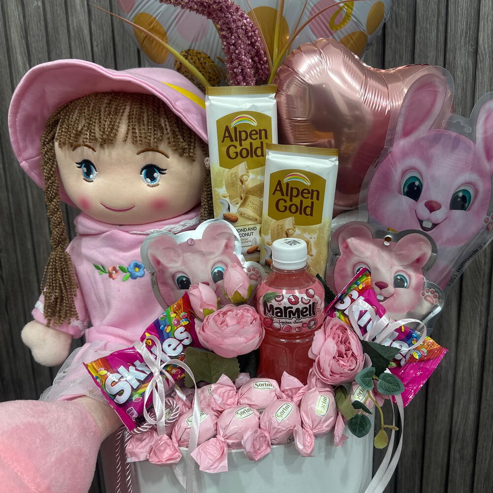 Caixa de chapéu - 1 un. Flores Artificiais - 10 un. skitles - 2 un. сорини конфеты - 10 un. алпен голд шоколад - 2 un. мягкая игрушка кукла - 1 un. канфеты зайчик - 500 gr. канфеты зайчик 2 шт. - 125 gr. сок мармел - 1 un. шари фолговые - 2 un.