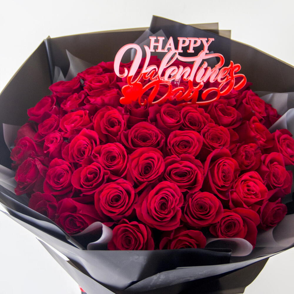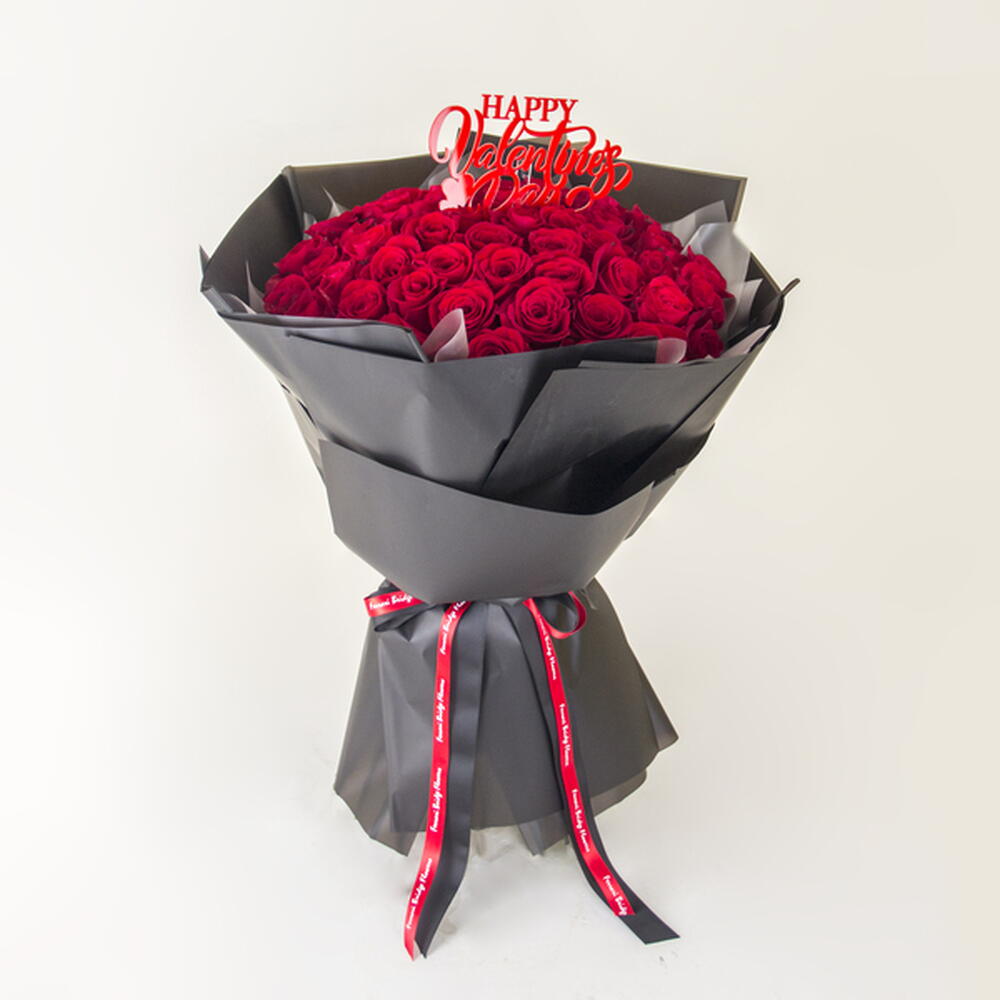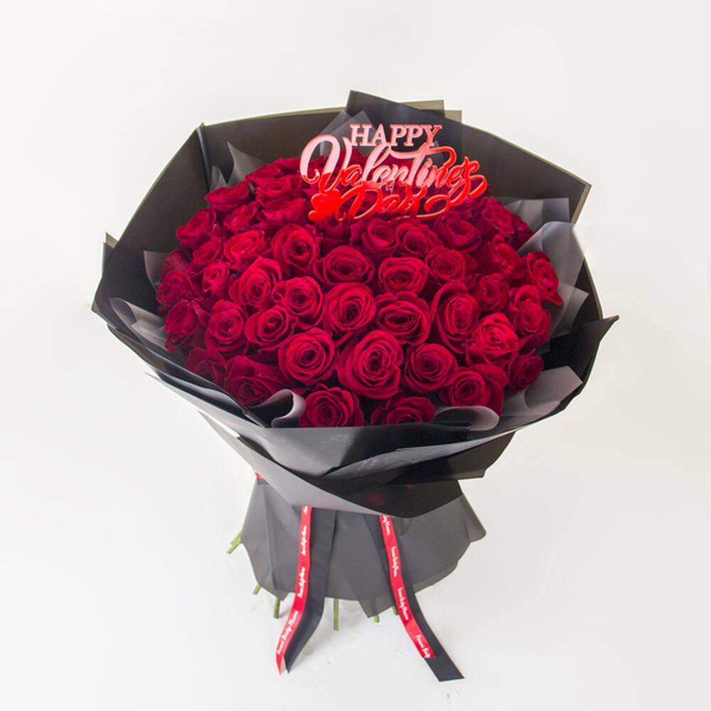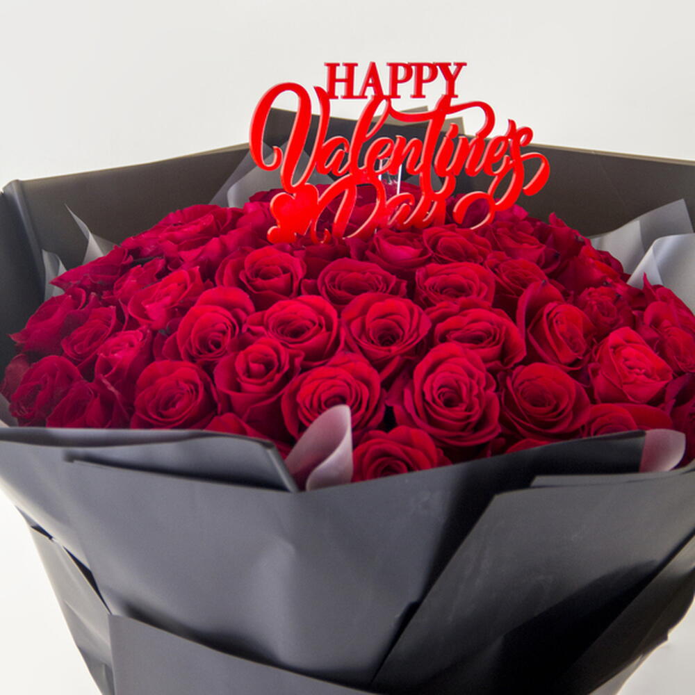Indulge in pure luxury with this lavish bouquet of 50 premium red roses, presented in a stunning arrangement and topped with a sparkling Happy Valentines topper. A gift that says I love you in the most extravagant way.