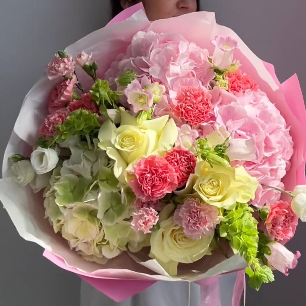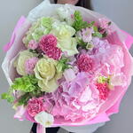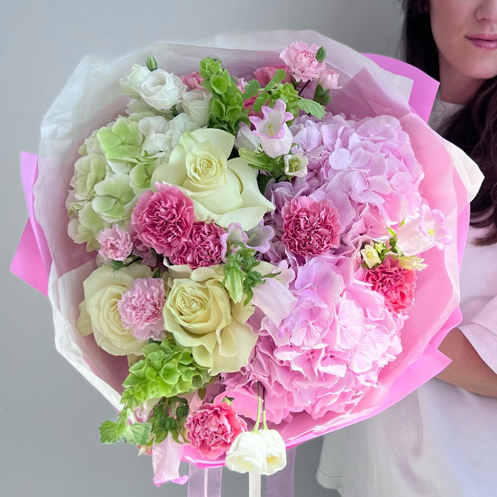 Hydrangea - 3 un. Lisianthus - 5 un. dianthus - 11 un. campânula - 5 un. rosas - 3 un.