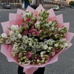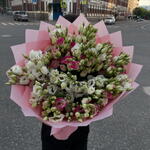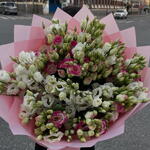 pink eustoma - 12 un. packing paper - 6 un. ribbon satin - 1 un. white eustoma - 13 un.