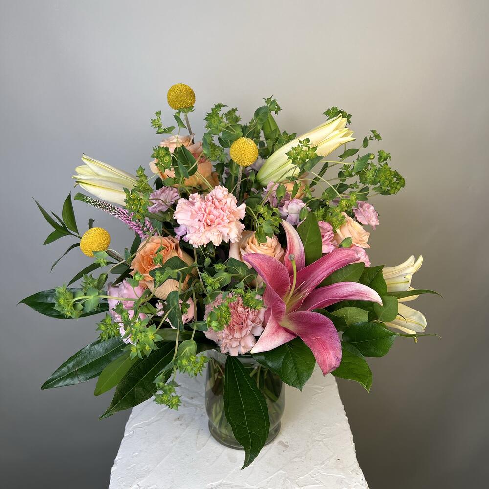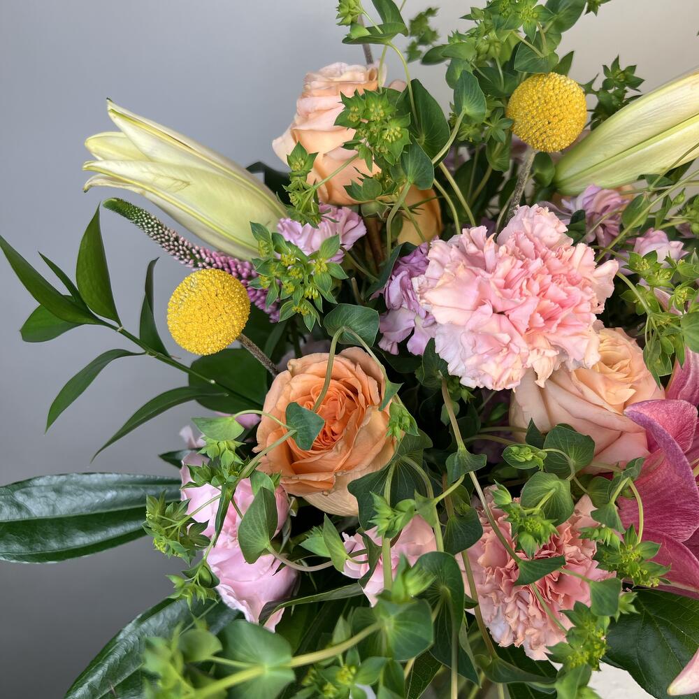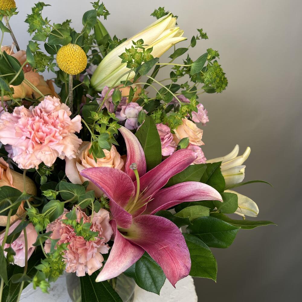 Lírios - 2 un. cravos - 5 un. craspédia - 3 un. mix de folhagens - 1 un. rosas - 5 un.