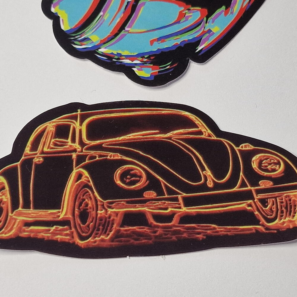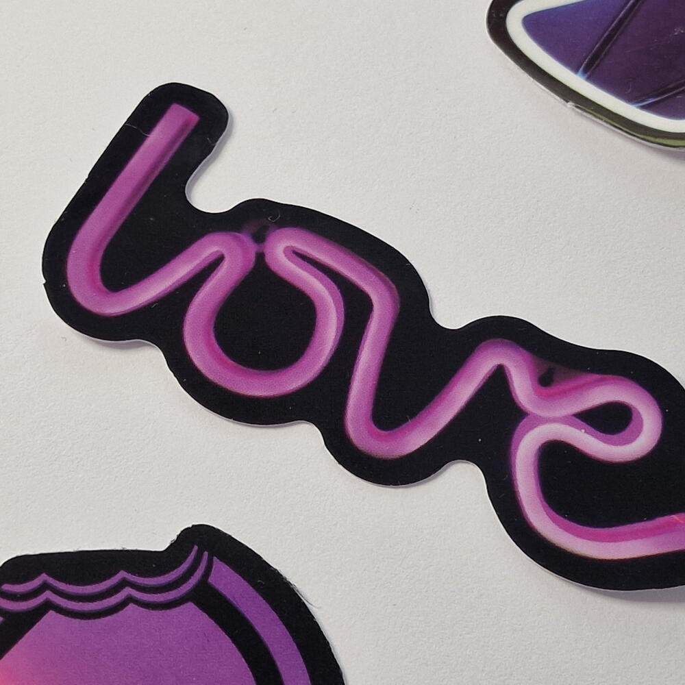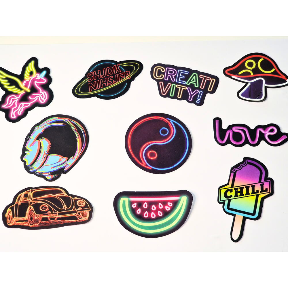 Set of 10 vibrant neon stickers featuring unique designs, including a flying unicorn, ice cream, and love motifs. These stickers are perfect for customizing laptops, notebooks, or phone cases. Packaged in a holographic zip-lock bag, they make an eye-catching gift for neon art lovers!