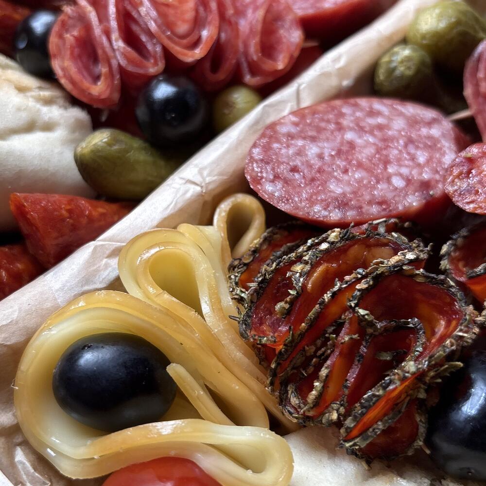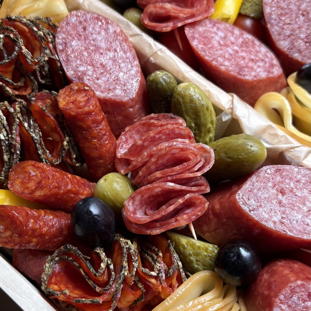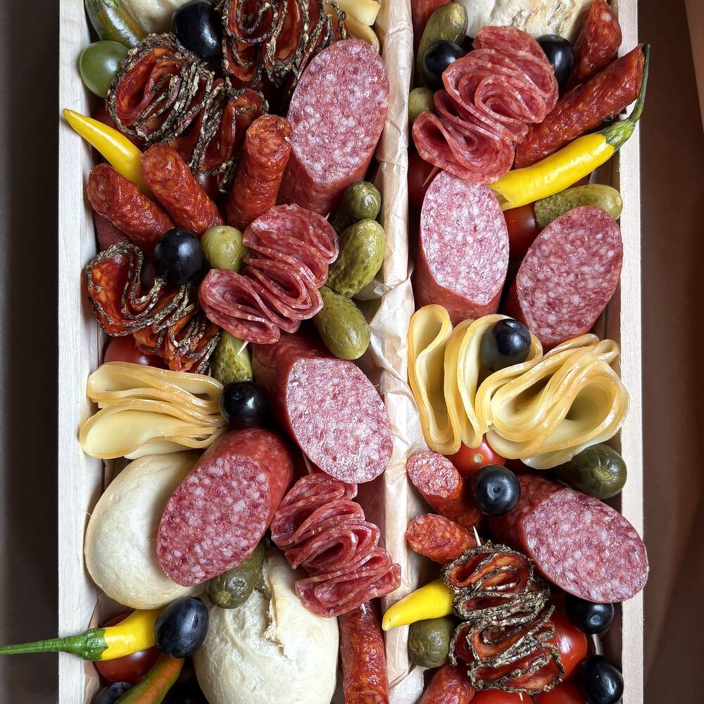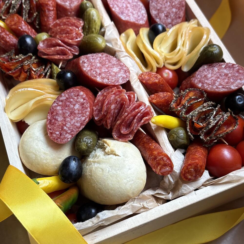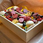 uvas - 100 gr. celofan - 1 un. kulen - 100 gr. cajna kobasica - 300 gr. traka - 1 un. chili paprika - 2 un. kobasica budimska - 100 gr. seri - 200 gr. kifle - 2 un. drvena gajba - 1 un. sir - 100 gr. kobacice - 100 gr.