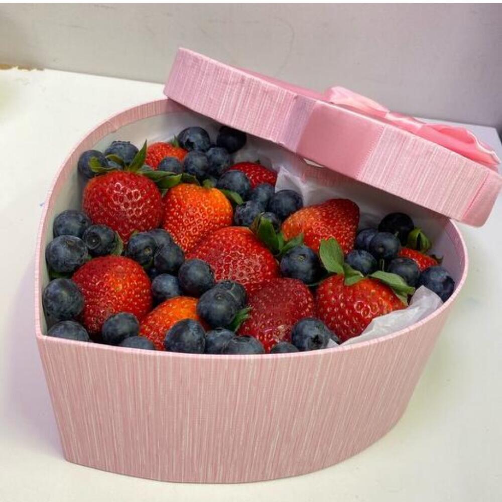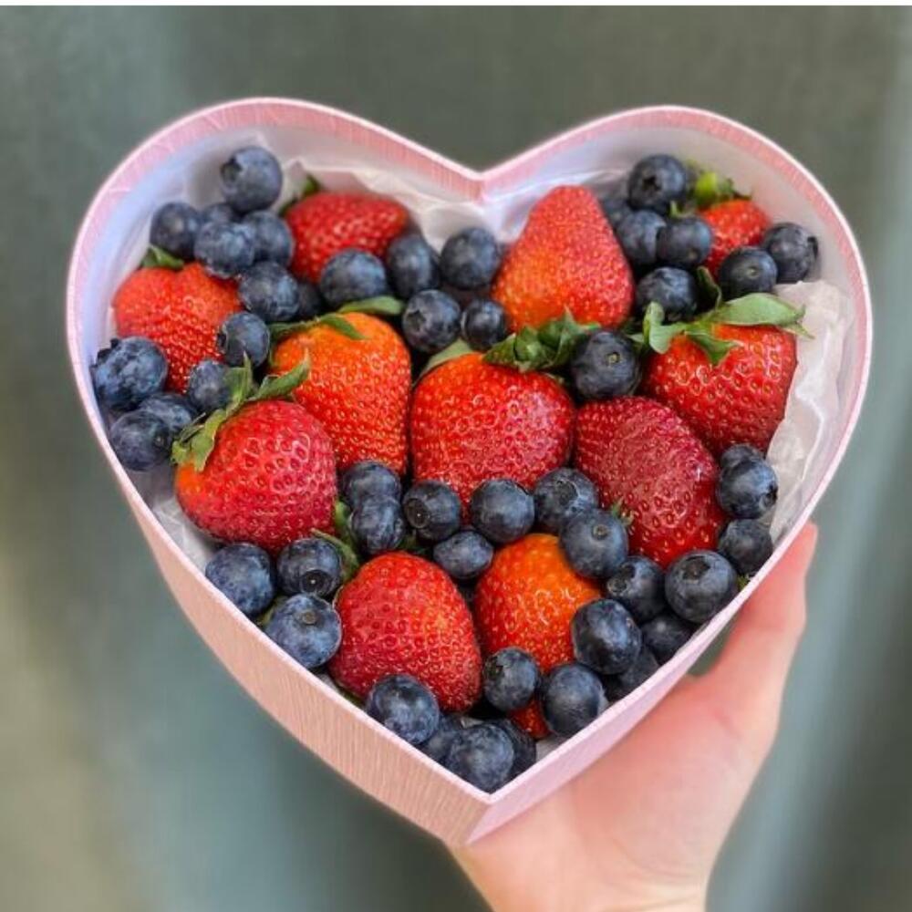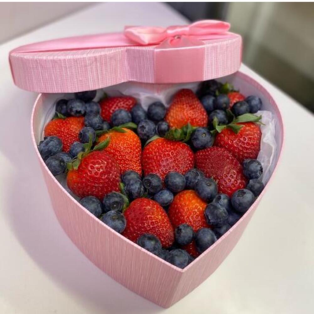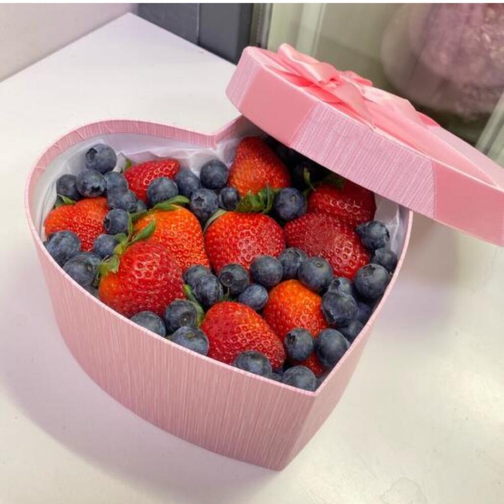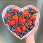 Morango - 250 gr. Blueberry - 250 gr. caixa de coração de chapéu - 1 un.