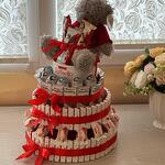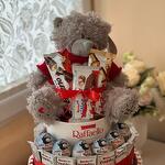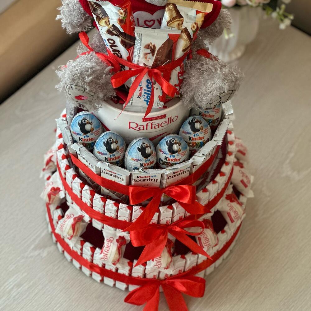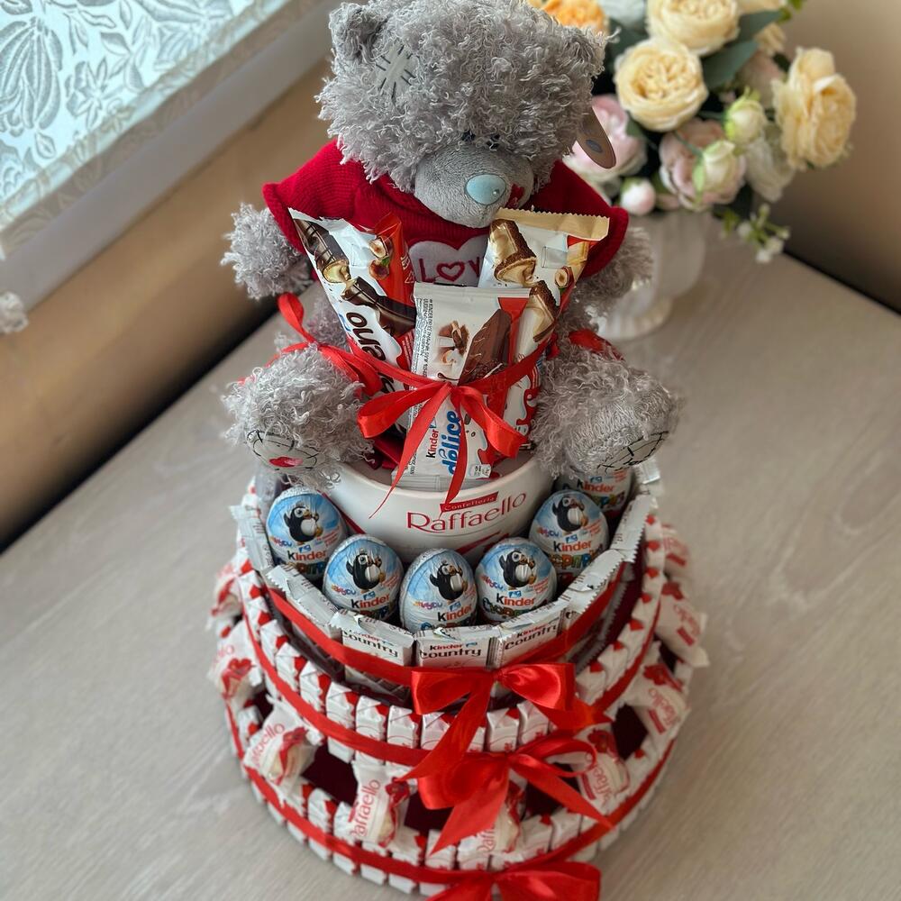 Набор всеми любимых шоколадок киндер, оформленных в трехъярусный торт с мягкой игрушкой на макушке. Эффектный подарок, который несомненно удивит и взрослого, и ребенка. А большое количество вкусняшек долго будет радовать получателя своим уникальным вкусом и дарить приятные эмоции от воспоминания пожаренных эмоций.