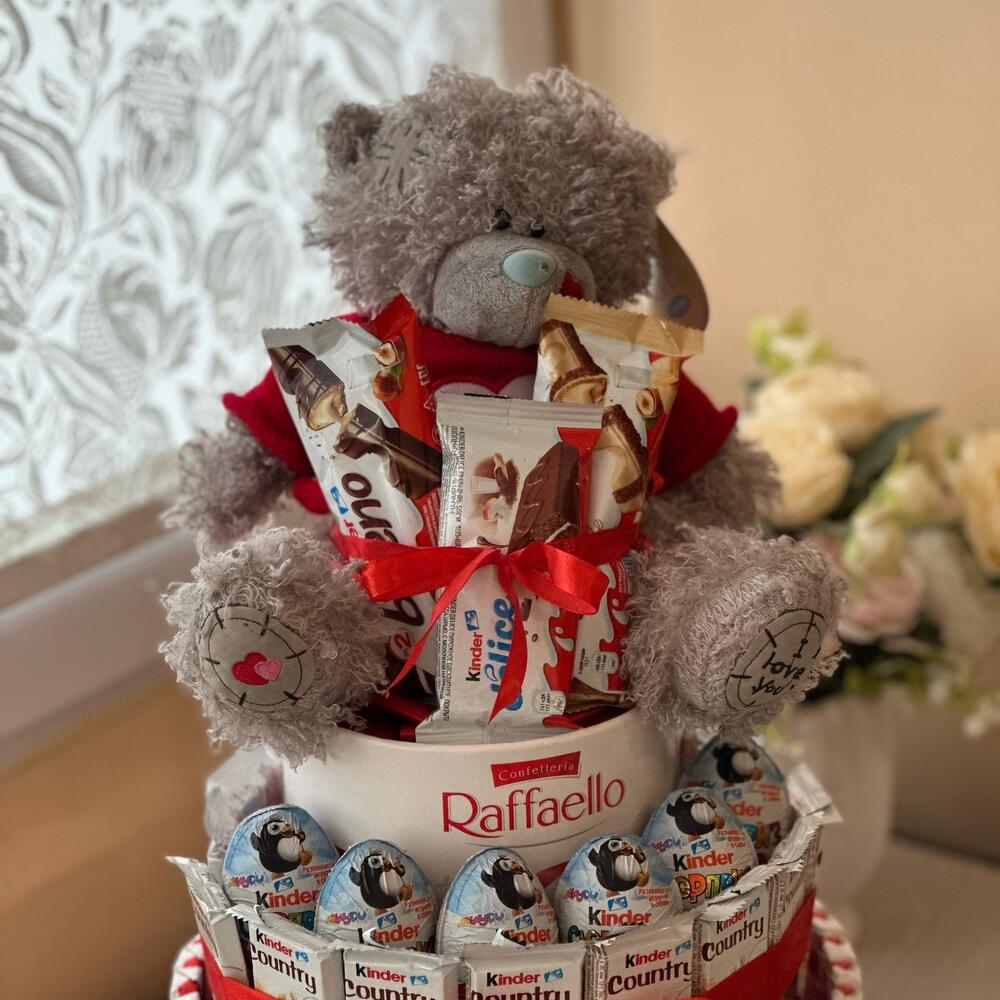 Kinder Surpresa - 6 un. Kinder Chocolate - 88 un. Kinder Delis - 1 un. Kinder Bueno - 2 un. Kinder country - 15 un. Raffaello 150 gr - 1 un. раффаэлло с бантом - 1 un. мишка тедди 20 см - 1 un.