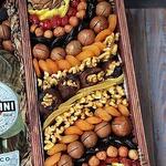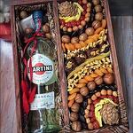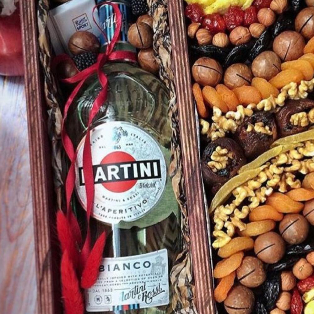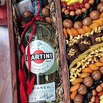 Noz - 30 un. Caixa de madeira - 1 un. Figo - 50 un. Damascos secos - 50 un. Ameixas - 50 gr. pera seca - 50 un. macadâmia em casca - 50 gr. martini bianco (0.5 л) - 1 un.