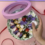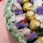Box - 1 un. Ferrero rocher - 5 un. Raffaello doces - 3 un. Cotton - 2 un. statica - 1 un. cartão - 1 un. crisântemo - 1 un. rosas - 3 un.