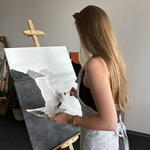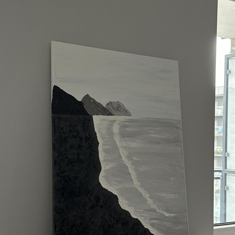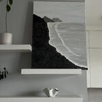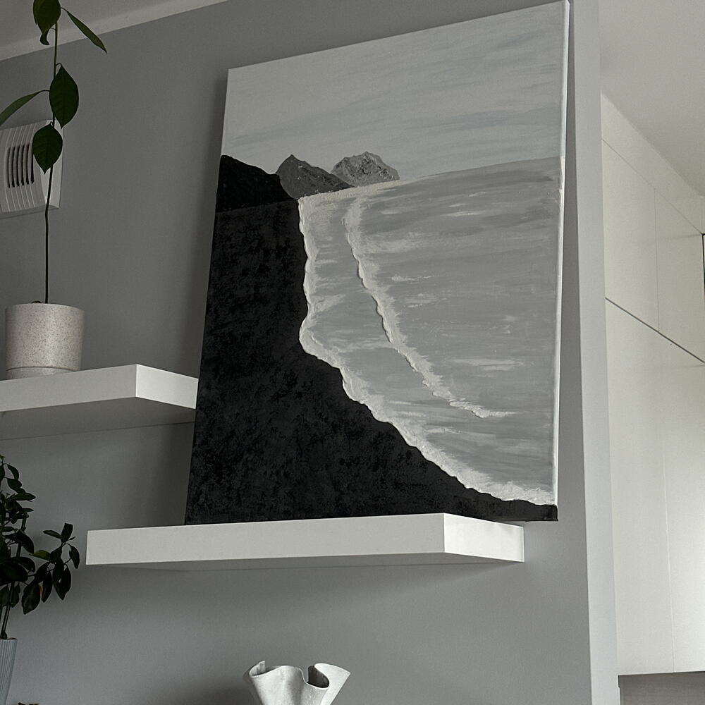 A textured painting inspired by the calm rhythm of the sea. Created with acrylic and texture paste, it combines deep black and soft gray tones with gentle white waves and a hint of blue horizon. The artwork captures the contrast between strength and serenity - dark sand meeting the quiet foam of the ocean. Handmade on canvas, size 60 × 80 cm. Perfect for a modern, minimalist interior or a cozy space that needs a touch of calm elegance. ⸻ A textured painting inspired by the calm rhythm of the sea. Made using acrylic and texture paste, it combines deep shades of black and gray with delicate white waves and a touch of blue. The artwork conveys the contrast between strength and calm - black sand meets the quiet foam of the ocean. Hand-painted on canvas, size 60 × 80 cm. Ideal for a modern, minimalist interior or a cozy space full of calm and elegance.