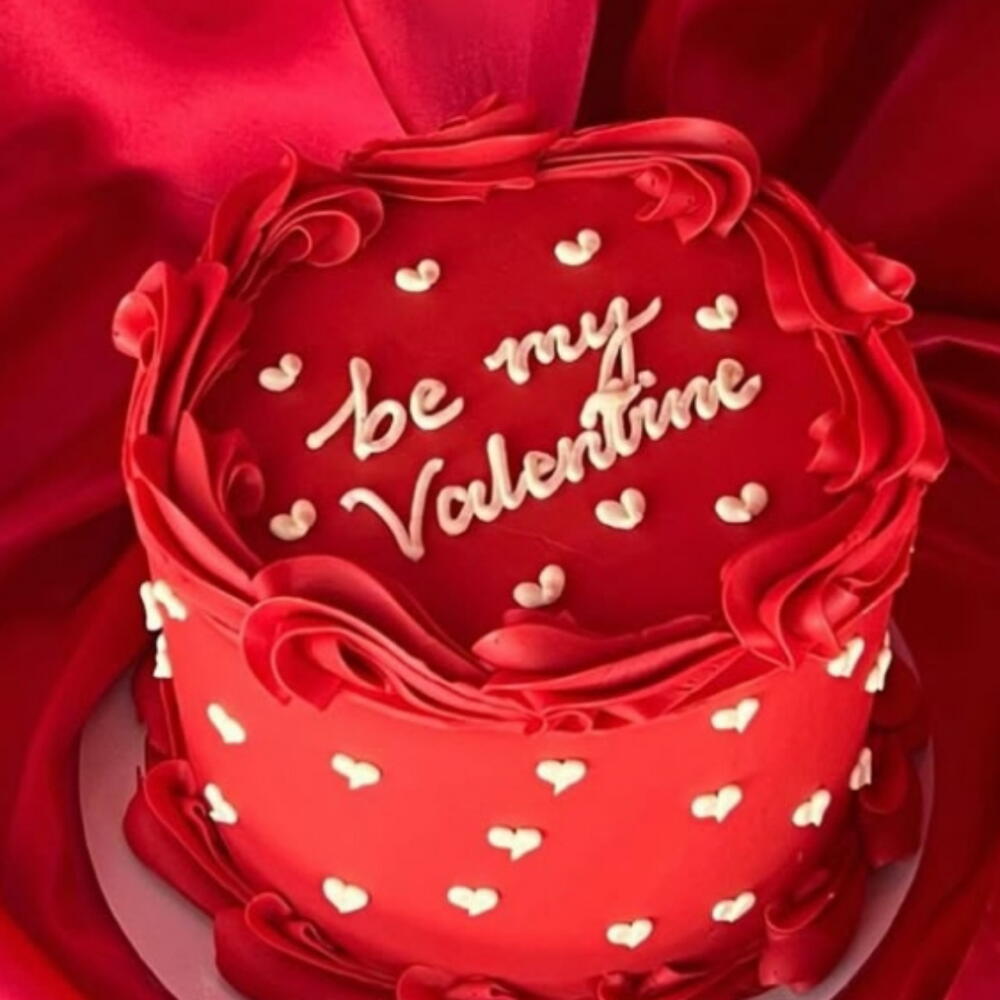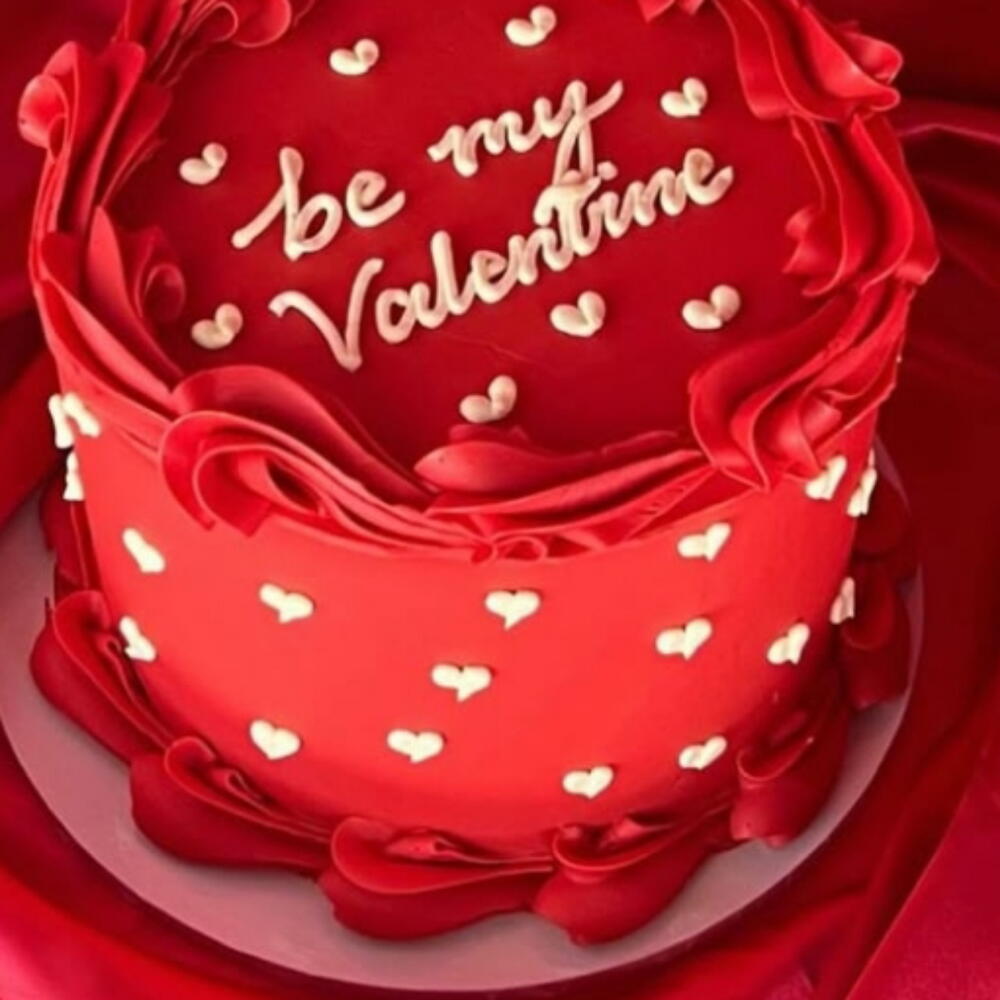 Романтичный праздничный торт в насыщенных красных оттенках, украшенный нежными кремовыми волнами и мини-сердечками. Надпись «Be my Valentine» делает его идеальным сладким признанием в любви. Отличный выбор ко Дню Святого Валентина — для любимого человека, второй половинки или в качестве эффектного подарка. 🎂 Начинка — на выбор 🎁 Возможна персональная надпись 📦 Аккуратная подарочная упаковка