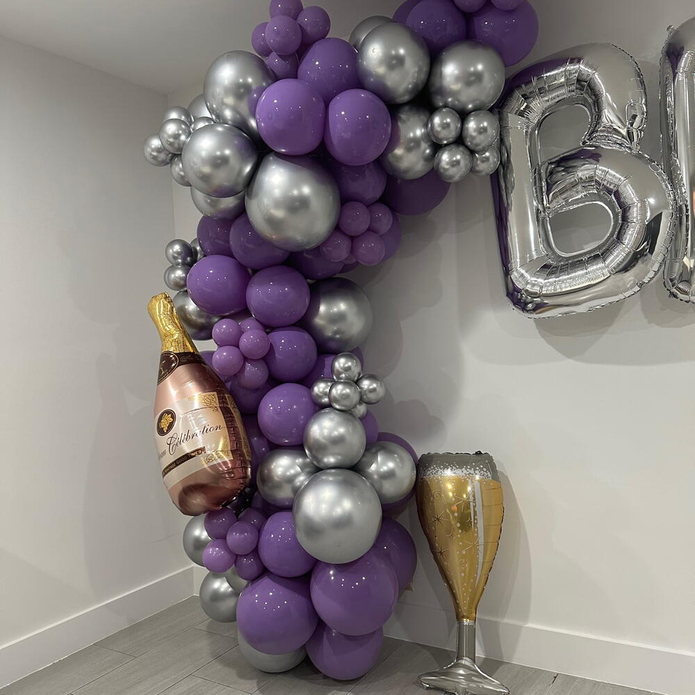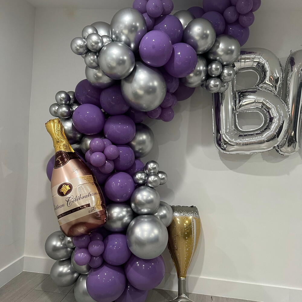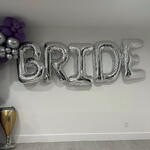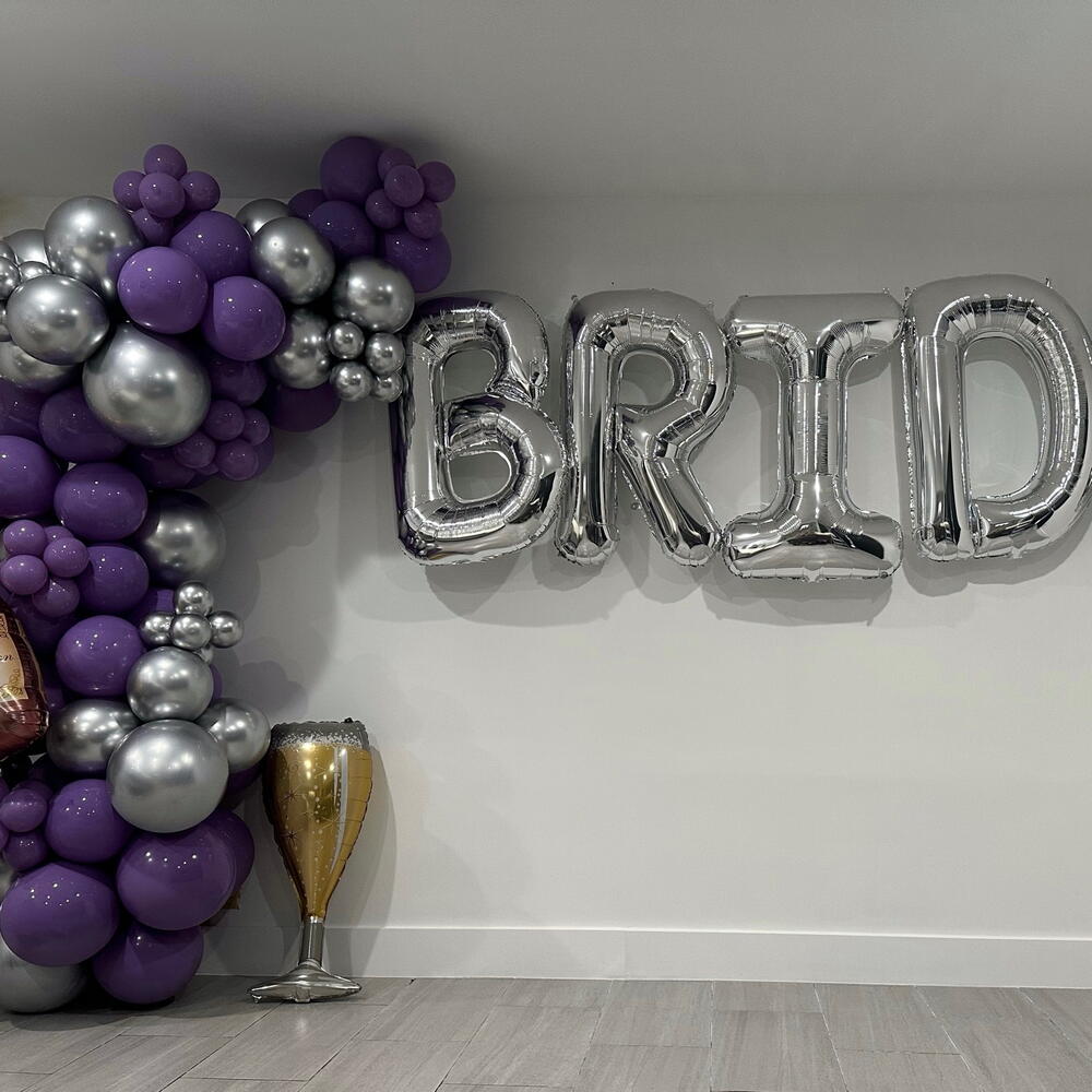 Bride garland balloons 12 feet, plus text Bride, 2 champagne balloons silver, purple colours