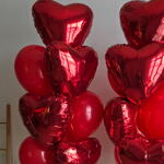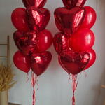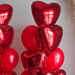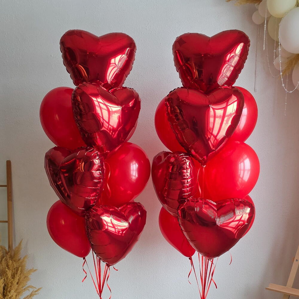 • Два фонтана, каждый из которых состоит из: • 4 красных фольгированных шаров в форме сердца. • 6 красных латексных шаров.