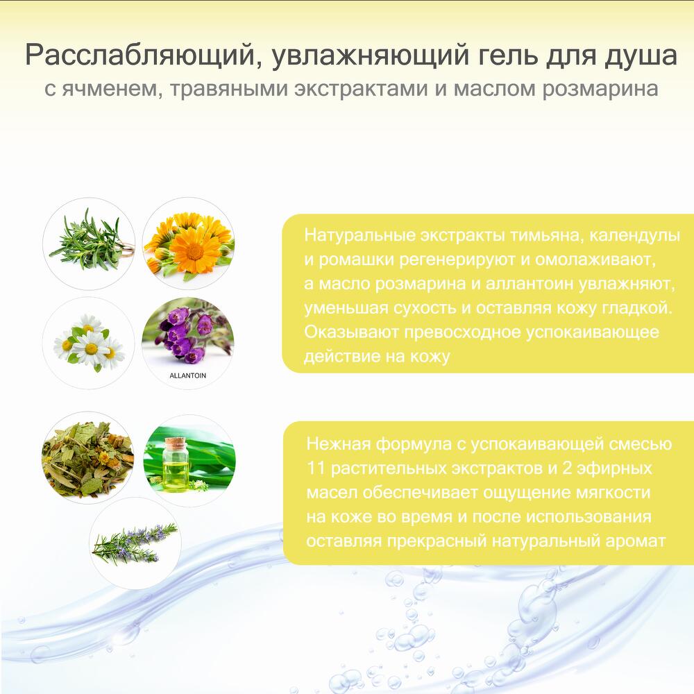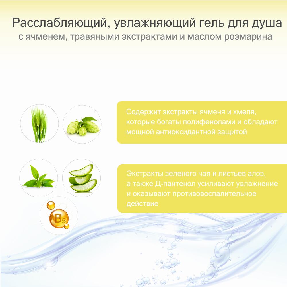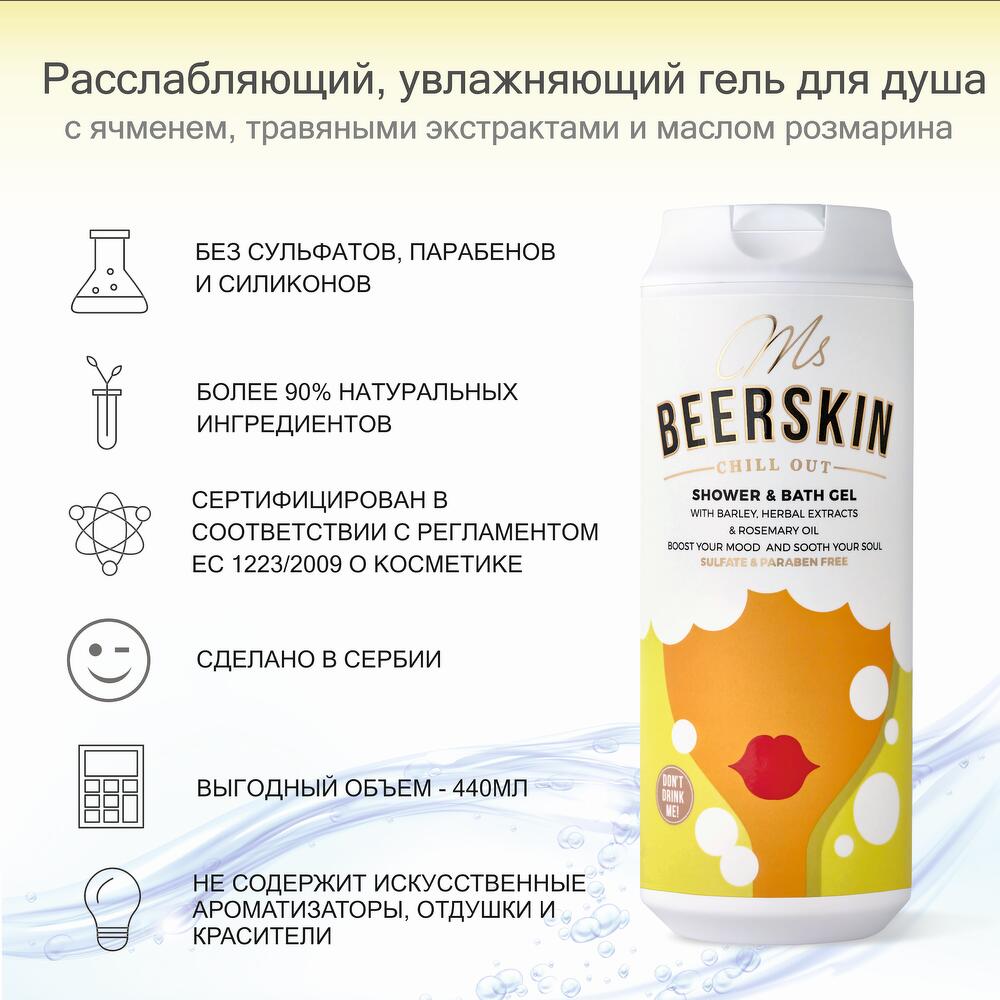 Chill out Shower & Bath gel with Barley, Herbal Extracts & Rosemary Oil Boost your mood and soothe your soul Ms Beerskin Chill Out Shower&Bath Gel is a gentle moisturizing & soothing Shower and Bath Gel for everyday use. It contains Barley and Hops Extracts, which are rich in polyphenols, and bring powerful antioxidant protection. Green Tea, Aloe Leaf Extract and Panthenol enhance hydration and have anti-inflammatory effect. Natural Thyme, Calendula and Chamomilla Extracts regenerate and rejuvenate, while Rosemary Oil and Allantoin moisturize, relieves dryness, leaving skin feeling smooth, provide an excellent calming and soothing effect on the skin. Gentle formula with calming mix of 11 Herbal Extracts and 2 Essential Oils provides a soft feeling to the skin during and after use and gives a wonderful aromatic scent. The formula is free of sulfates, parabens, silicones, artificial fragrances or perfumes and dyes.