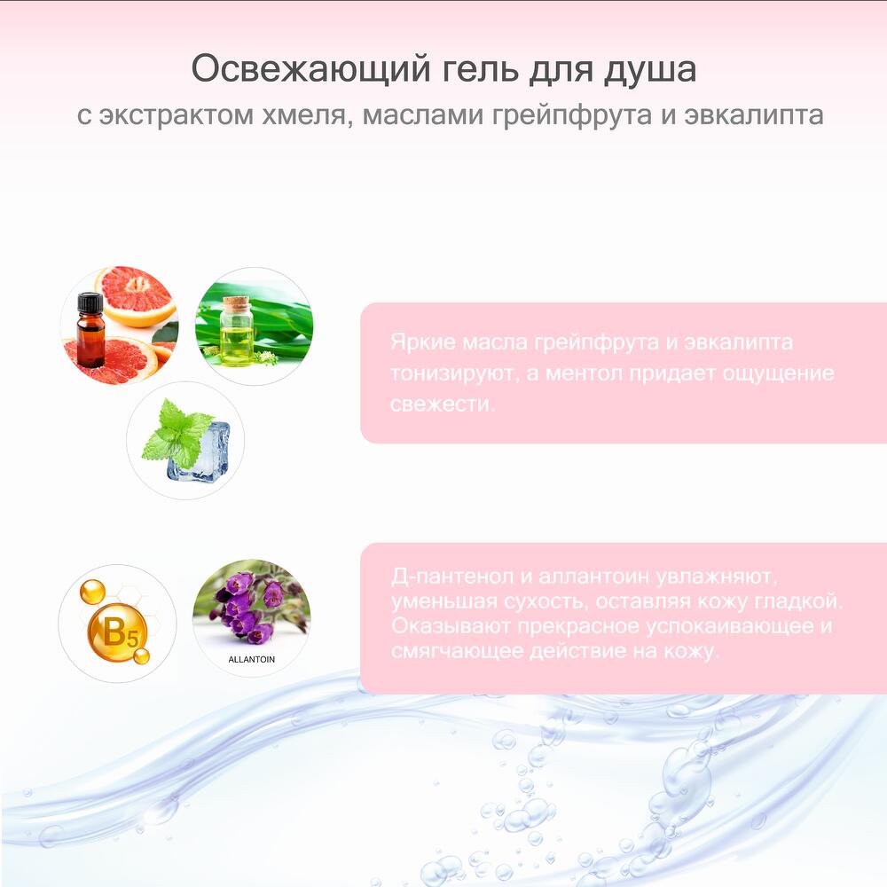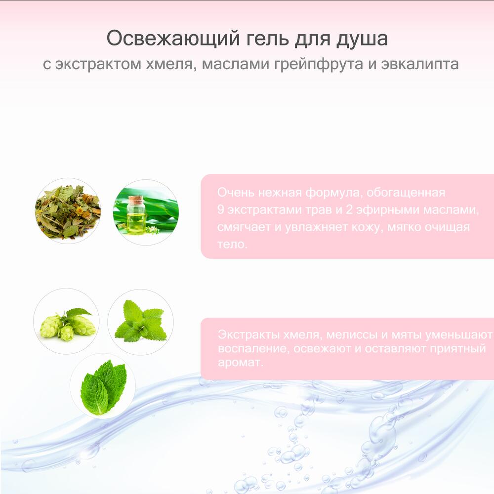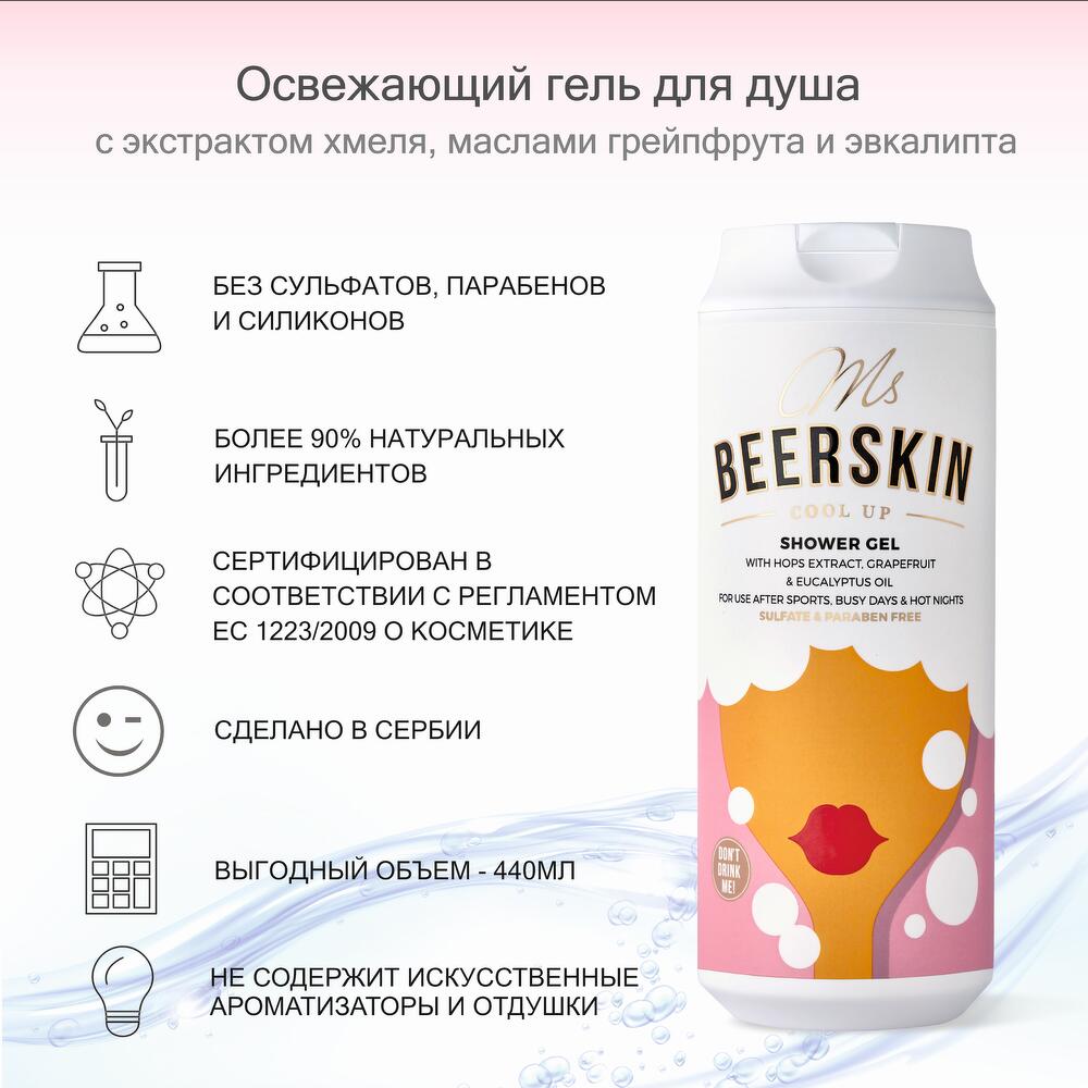 Cool up Shower gel with Hops Extract, Grapefruit & Eucalyptus Oil For use after sports, busy days & hot nights Ms Beerskin Cool Up Shower Gel helps you to wake up and start your day or cool down after a power workout. Extra gentle formula enriched with 9 Herb Extracts and 2 Essential Oils softens and moisturizes skin, while gently cleansing your body. Hops, Melissa, and Peppermint Extracts refresh and leave a minty scent. Bright Grapefruit and Eucalyptus oil tones up, while Menthol gives a crispy fresh feel. Panthenol and Allantoin moisturize, relieve dryness, leaving skin feeling smooth, and provide an excellent calming and soothing effect on the skin. The formula is free of sulfates, parabens, silicones, artificial fragrances or perfumes and dyes.
