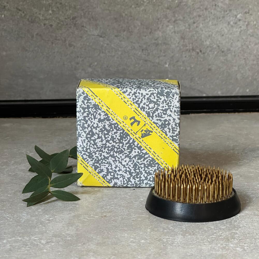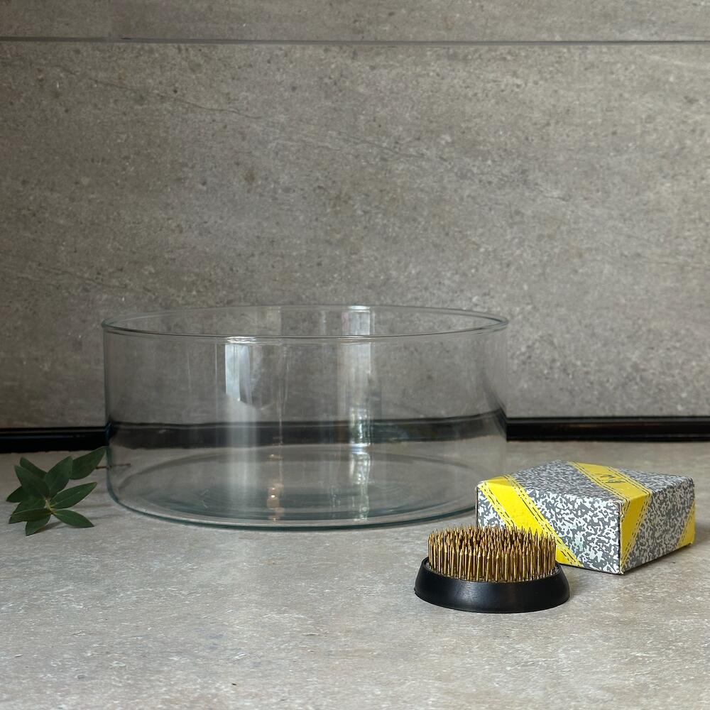 Set of vase and kenzan for creating floral arrangements. The metal base of the kenzan is coated with a rubber layer to prevent slipping and damage to the vase. Weight: 271 g Kenzan dimensions: needle height 13 mm, diameter 8 cm Material: metal Care instructions: wash after each use, store in a dry place Vase material: glass Dimensions: width 22 cm, height 9 cm Care instructions: clean with a regular cleaning agent