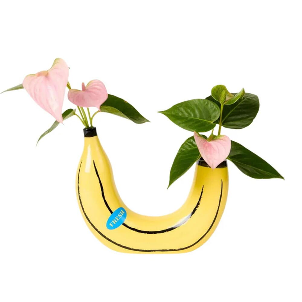 This vibrant banana vase with double space for your flowers will give your home a happy feeling. Vaza Banana - dekoracija poznatog španskog brenda DOIY. Ova vaza u obliku banane sa duplim prostorom za vaše cveće pružiće vašem domu srećno okruženje. Dimenzije: 22 x 19 x 6 cm, 0,6 kg Boja: žuta Nega: Prebriši vlažnom krpom Materijal: Kamenina, Glazura u boji Brand: DOIY (Španija)