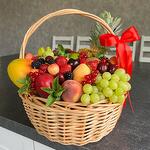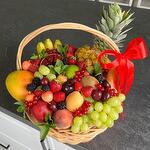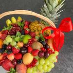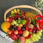 pineapple - 1 pcs kiwi - 5 pcs pear - 5 pcs apple - 5 pcs mango - 2 pcs wicker basket - 1 pcs bananas - 1 pcs nectarine - 5 pcs pomegranate - 3 pcs fresh strawberries - 500 g seasonal berries - 500 g grape bunch - 3 pcs
