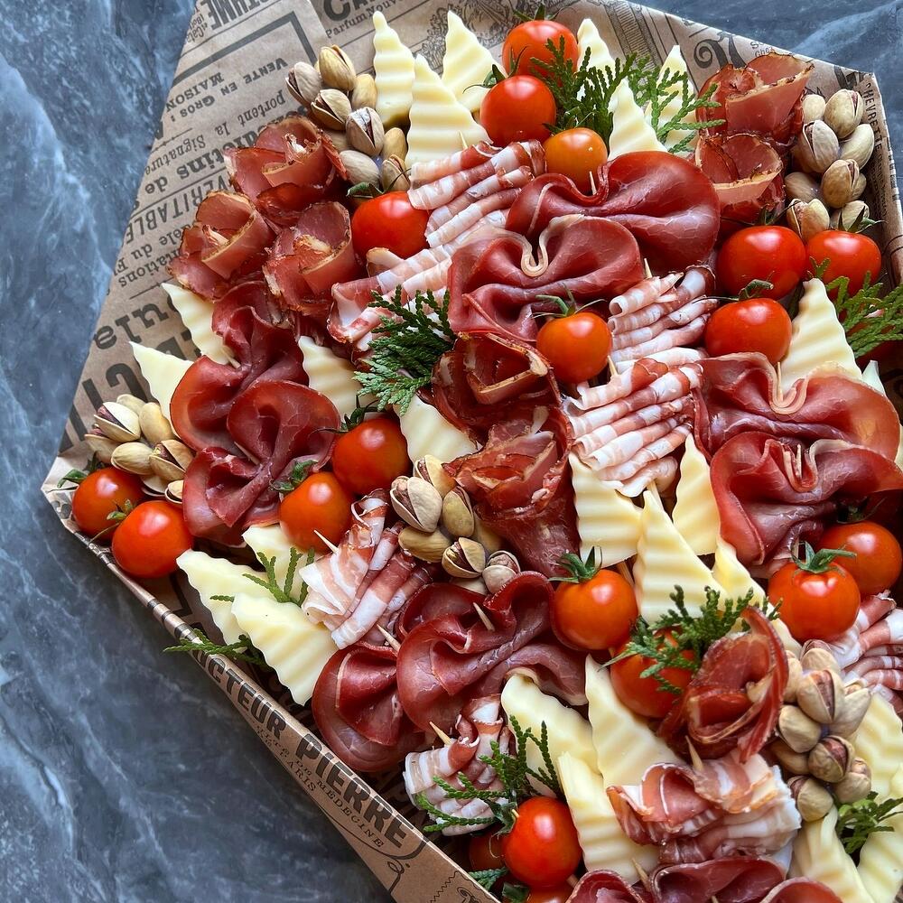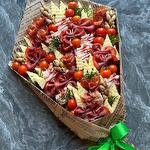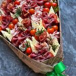 Appetizer bouquet: pork, beef, cheese, pistachios, cherry tomatoes, pepperoni