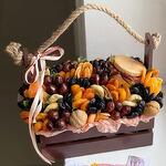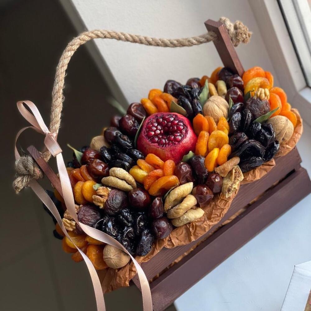 Basket wooden - 1 pcs Dried apricots - 200 pcs Prunes - 100 g Dried figs - 200 pcs garnet red - 1 pcs walnut in a shell - 5 pcs dates Royal - 200 g
