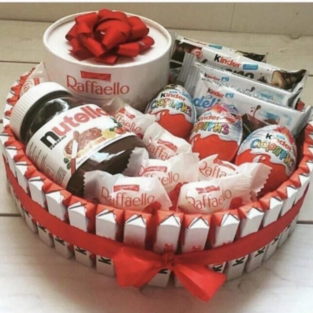 Satin Ribbon - 1 pcs Kinder surprise - 3 pcs Kinder chocolate - 40 pcs Nutella - 1 pcs Kinder Delis - 2 pcs Kinder Bueno - 2 pcs раффаэлло 200гр подарочная коробка - 1 pcs раффаэлло конфеты штучно - 7 pcs