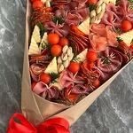 Mans bouquet of appetizers: cheese, beef and pork slices of 3 kinds, cherries on a branch, pistachios