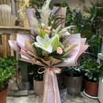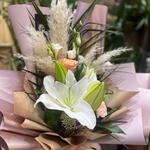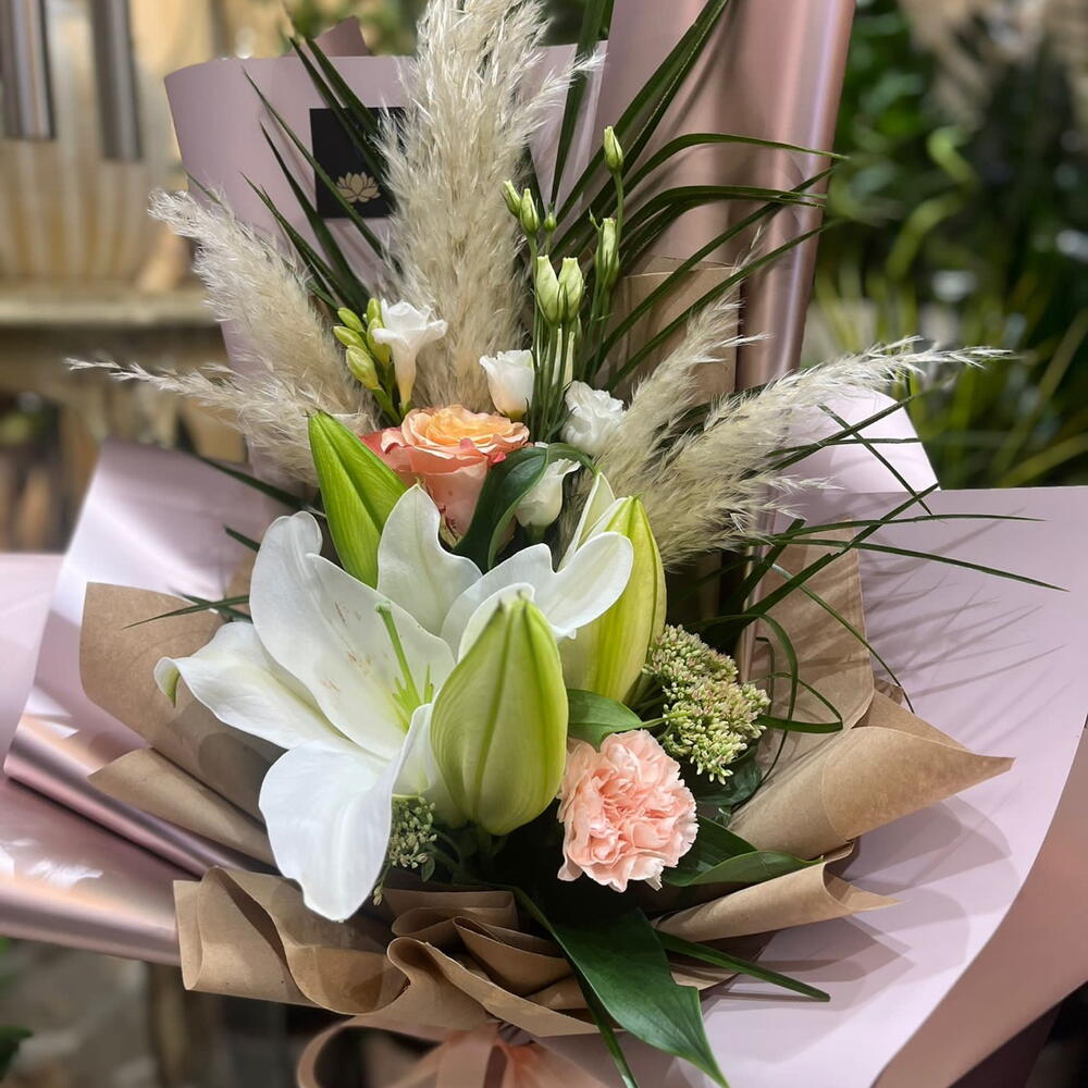 Satin ribbon - 1 pcs Lisianthus - 1 pcs rose - 1 pcs decorative paper - 5 pcs carnation - 2 pcs pampas grass - 5 pcs mix greenery - 4 pcs oriental lilies (pink or white) - 1 pcs