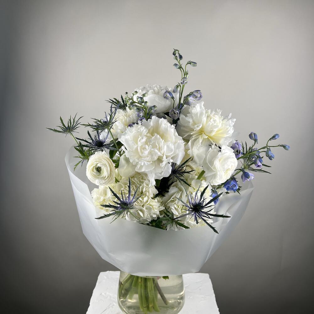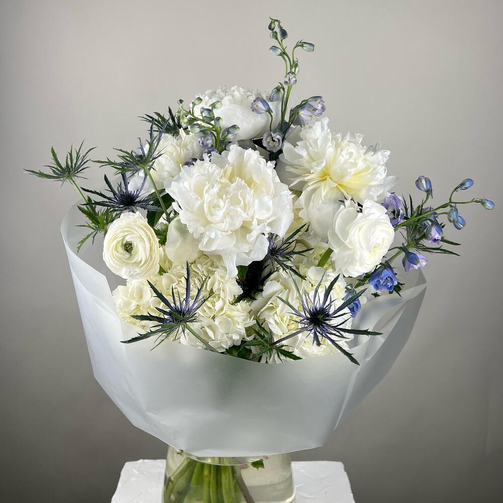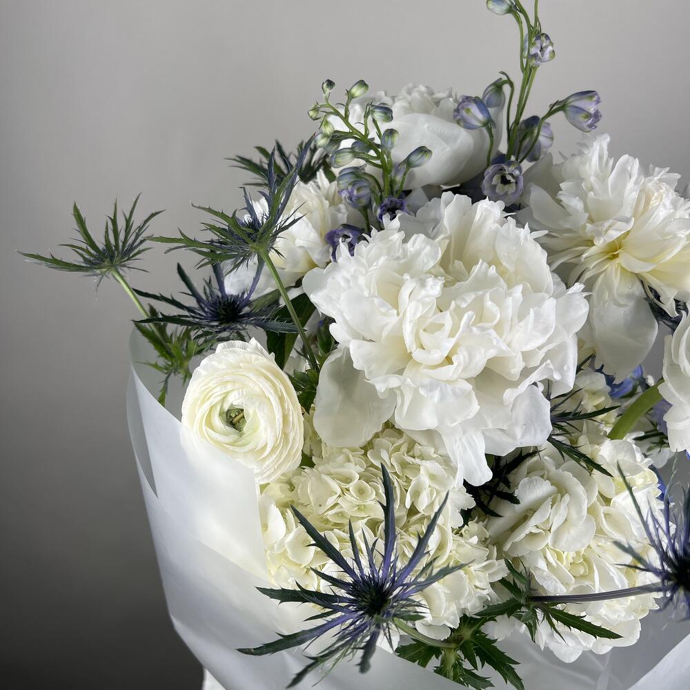 ranunculus - 5 pcs peonies white - 5 pcs eringium blue - 3 pcs delphinium blue - 5 pcs hydrangea - 4 pcs