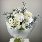 Presenting the Florists Specials, an exquisite handpicked collection perfect for those who appreciate the language of flowers. This vibrant arrangement comprises of 5 delicately hued ranunculuses and 5 soft white peonies, delicately complementing each other. Your eyes will be drawn to the bold colours of the 3 eringium blues and 5 blue delphiniums. To round it off, the bouquet includes 4 full-bodied hydrangeas. Each arrangement is crafted with love, aiming to capture natures transient beauty in every stalk and bud. Perfect for any occasion, this floral arrangement is not just a gift but an experience, a breath of fresh air in the form of flowers to bring light to day of a loved one.