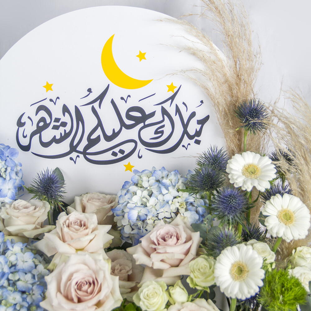 Gerbera - 3 pcs blue hydrangea - 3 pcs green hydrangea - 1 pcs roses - 6 pcs spray roses - 3 pcs ramadan whishes box - 1 pcs