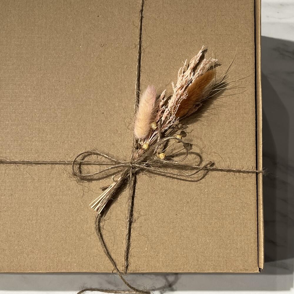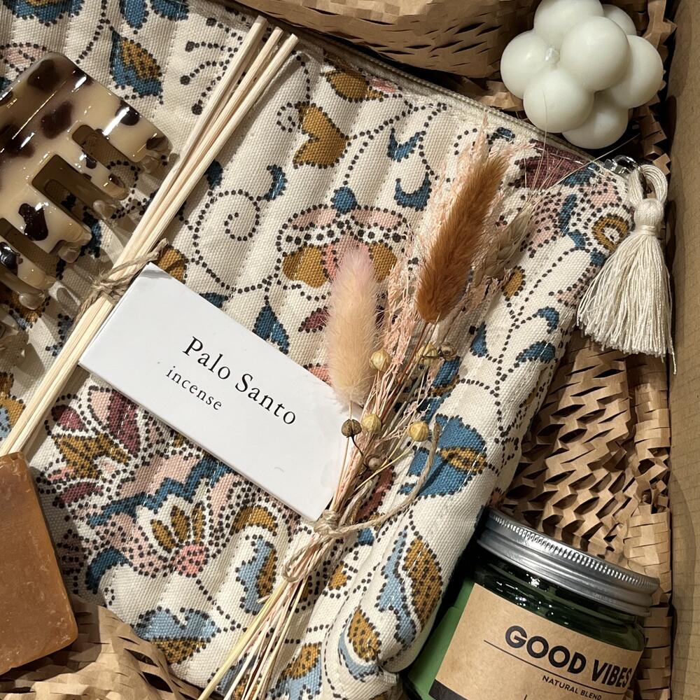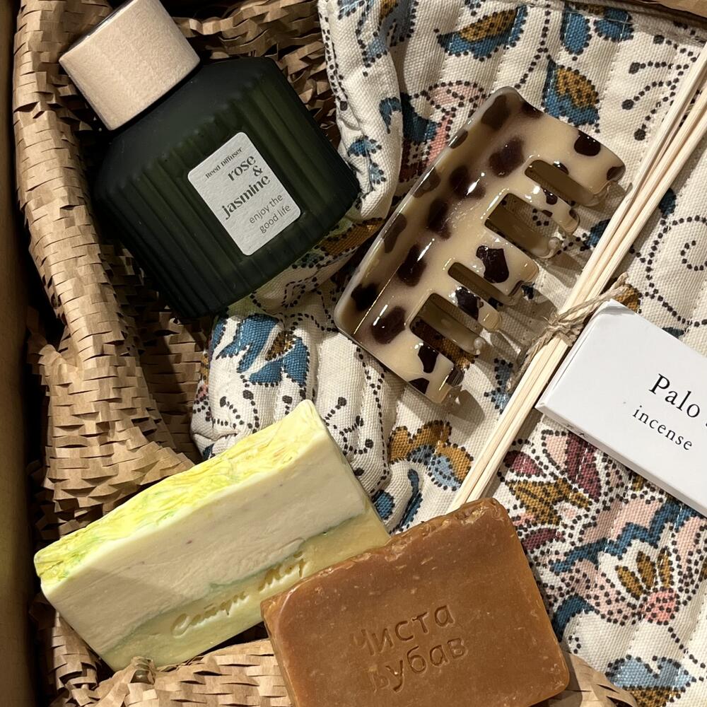 The set includes: • Aroma diffuser • A candle in a glass • Aroma shower soap - 2 bars • Palo Santo sticks • Soy candle • Fabric makeup bag • Hair claw clip The set is thoughtfully wrapped in kraft paper and presented in a box, beautifully adorned with dried flowers.
