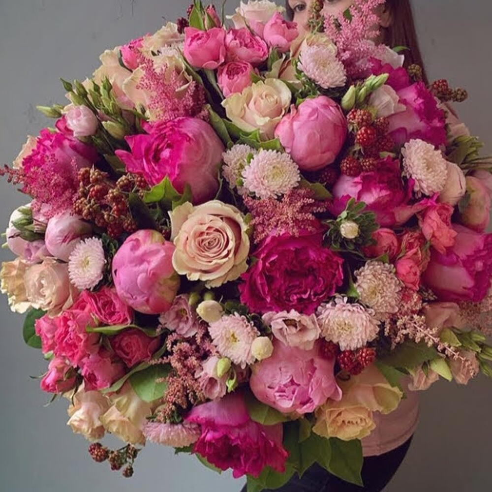 Eustoma - 5 pcs pink santini - 4 pcs single pink rose - 7 pcs peonies - 5 pcs cut greenery - 10 pcs branch rose - 6 pcs