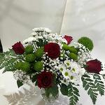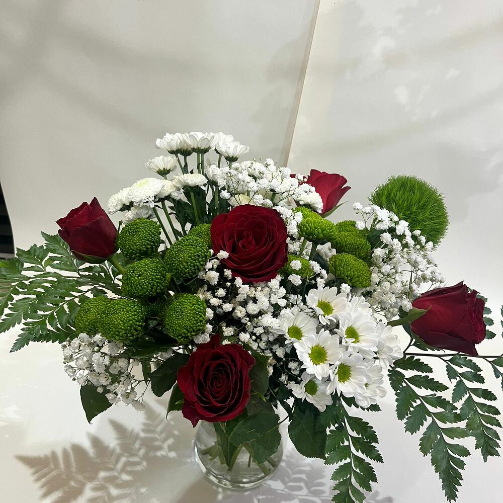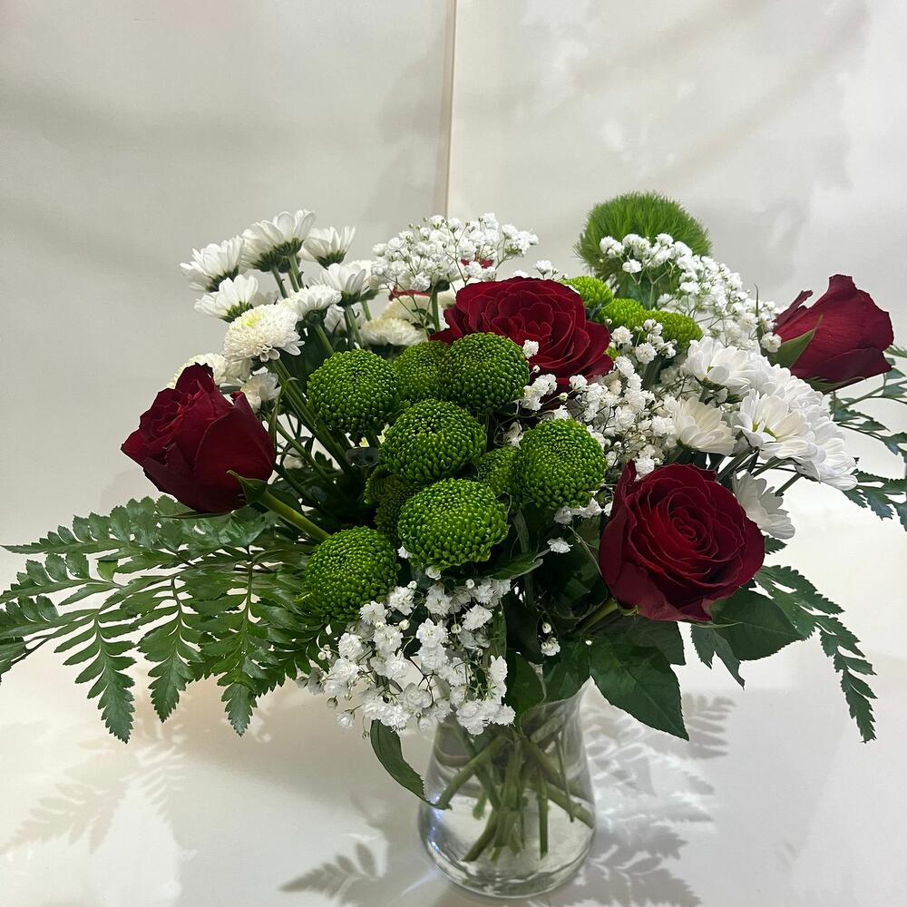 Chrysanthemum - 6 pcs Gypsophila - 2 pcs Fern - 2 pcs Vase - 1 pcs rose - 5 pcs carnation - 1 pcs