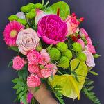 Gerbera - 2 pcs Anthurium - 2 pcs santini - 2 pcs hypericum - 2 pcs roses - 2 pcs spray roses - 1 pcs