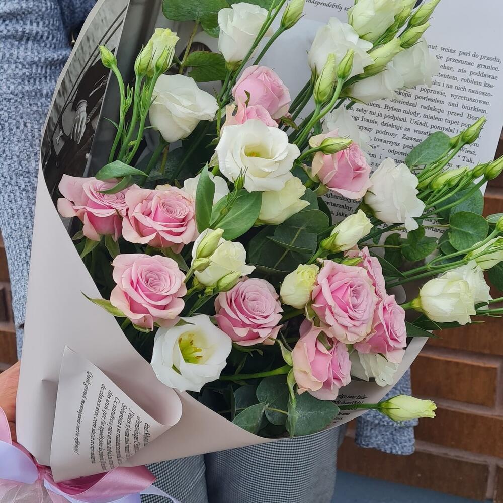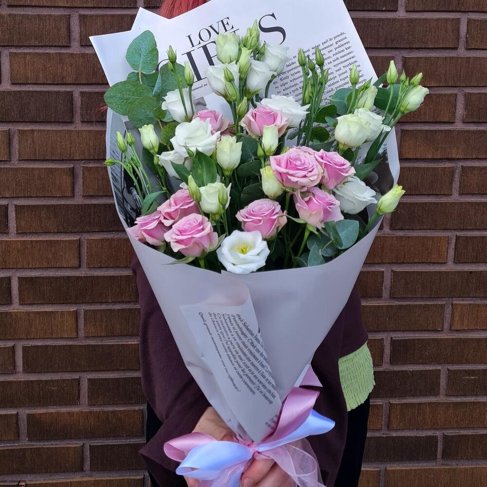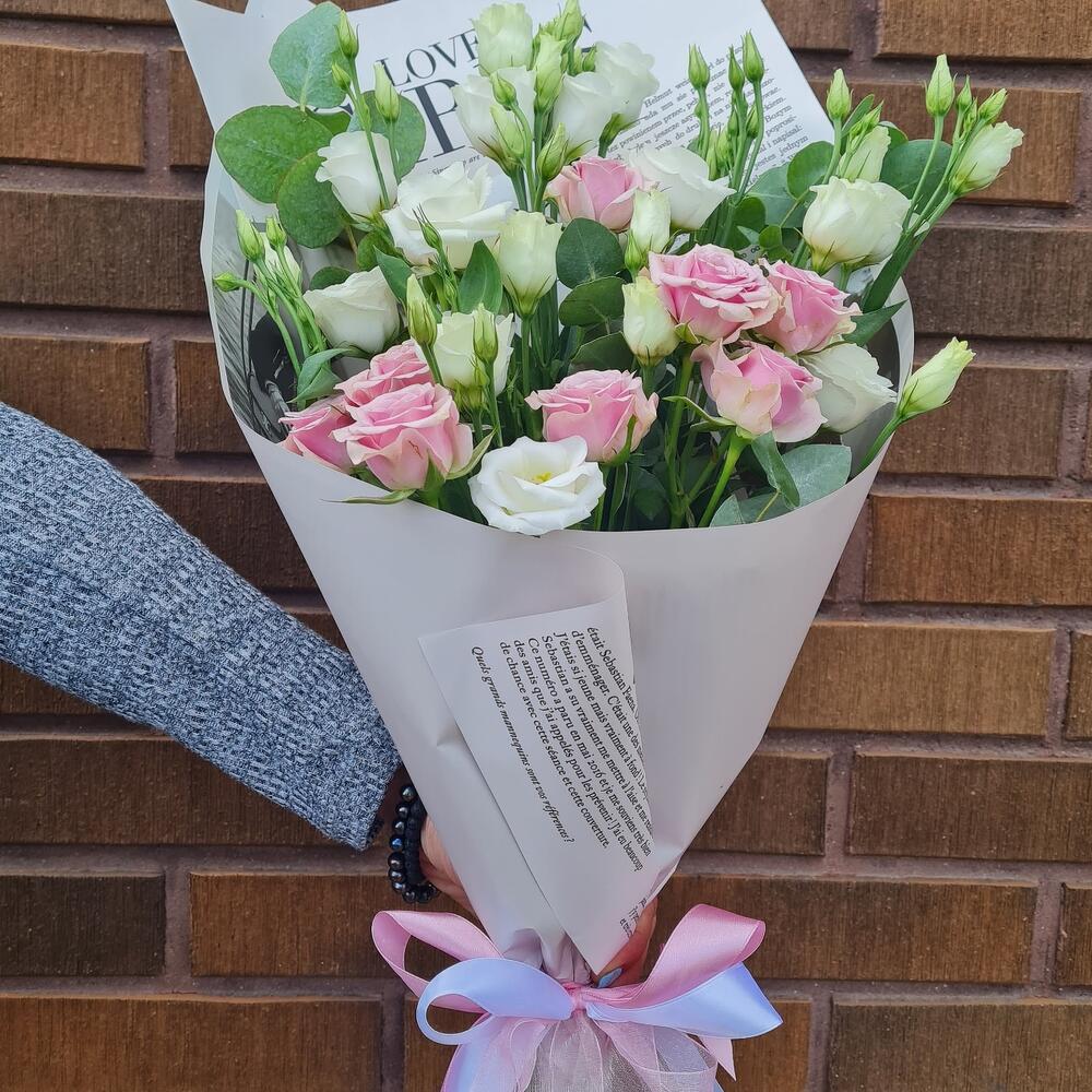 Eustoma - 3 pcs eucalipto cinerea - 1 pcs roses spray - 3 pcs