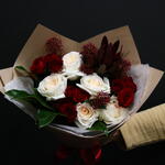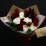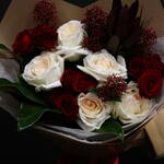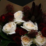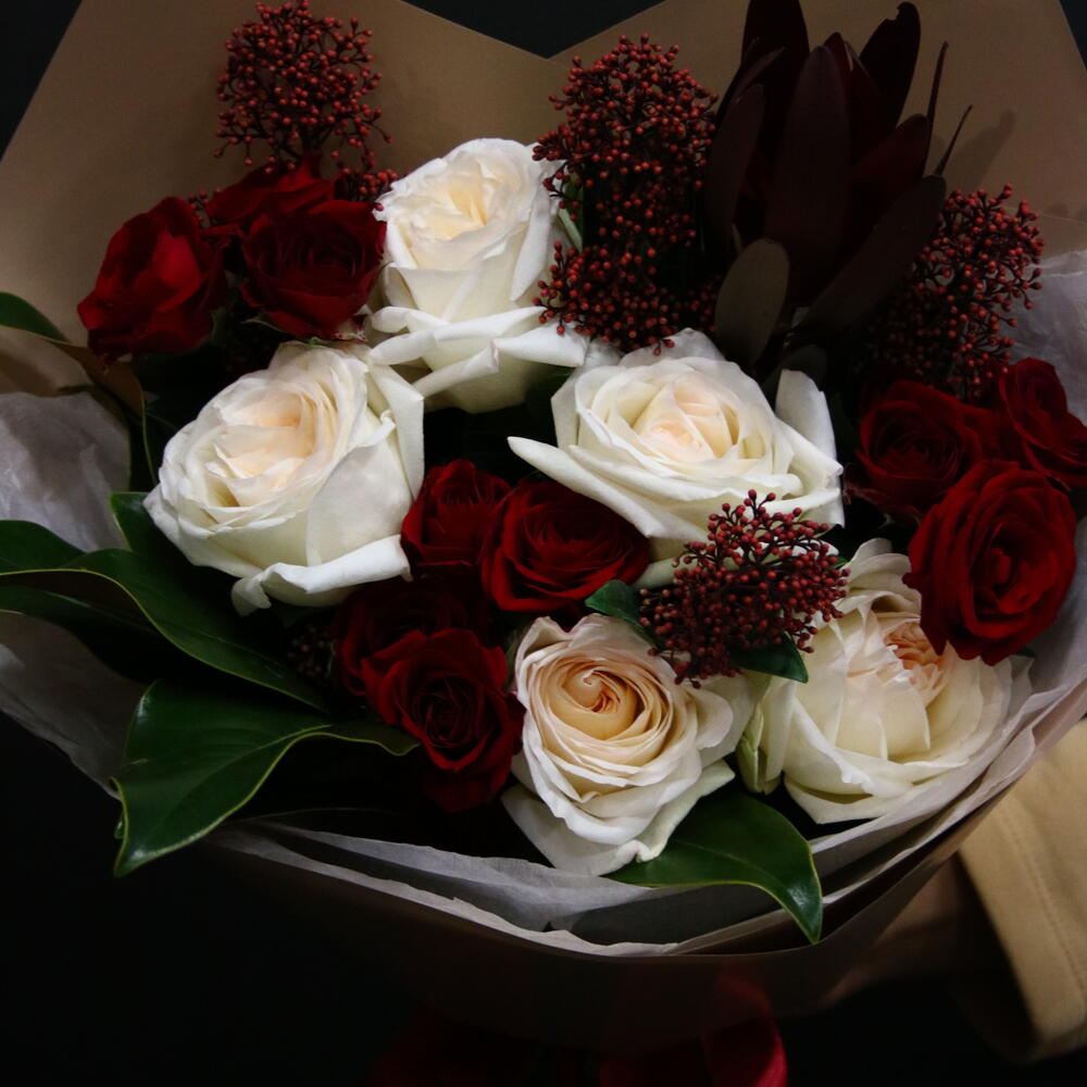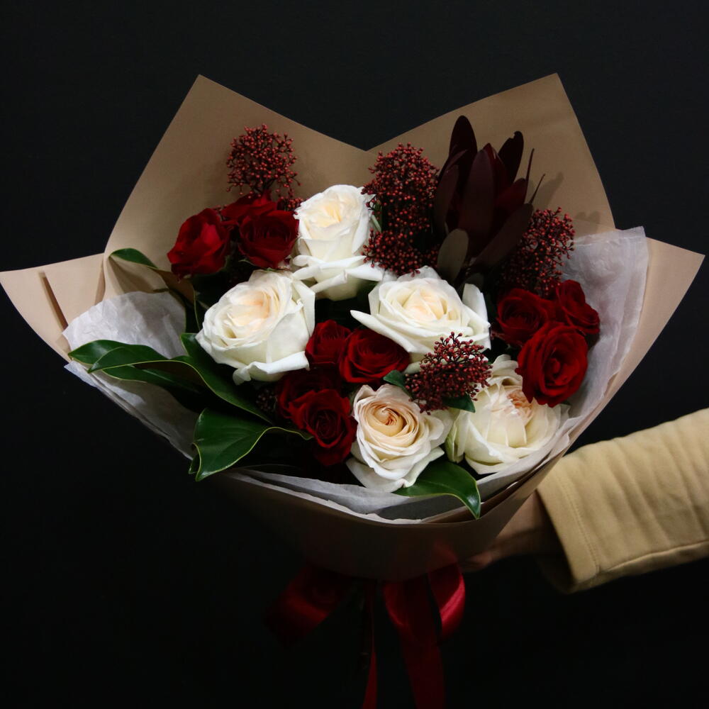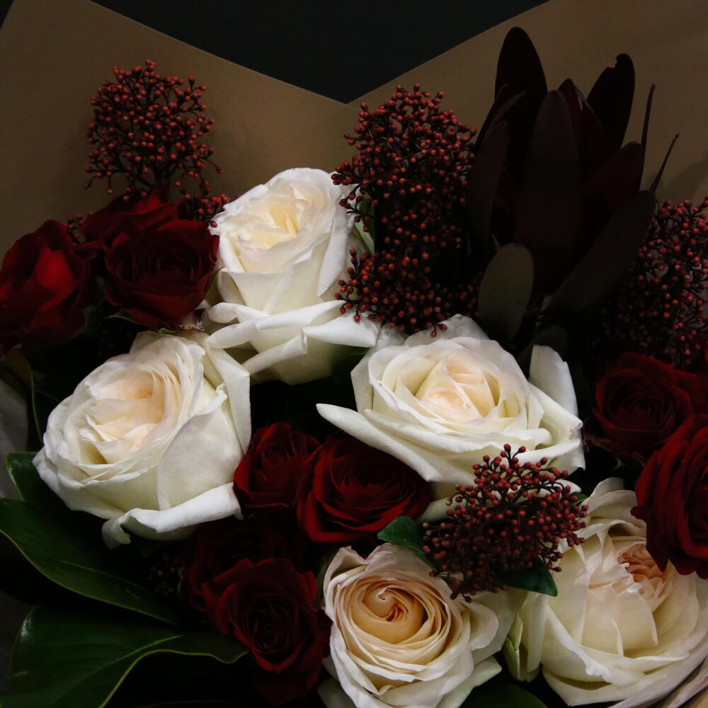 leucodendron - 1 pcs magnolia leaves - 1 pcs skimmia red - 2 pcs red shrub roses - 3 pcs peony roses white ohara - 5 pcs