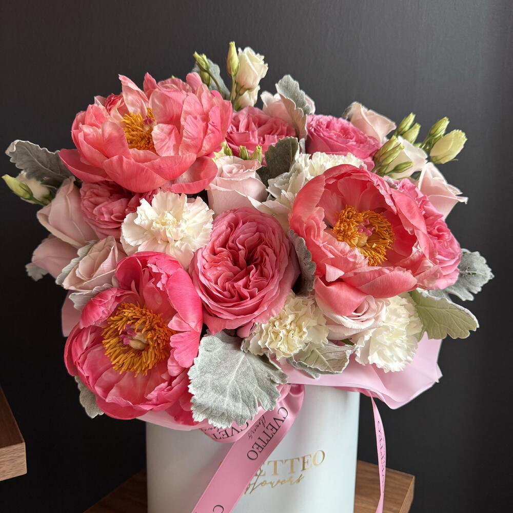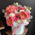 Spray rose - 10 pcs Box - 1 pcs rose - 10 pcs carnation - 7 pcs eucalyptus cineria - 3 pcs peonies - 3 pcs hydrangea white - 3 pcs lisianthus white - 2 pcs