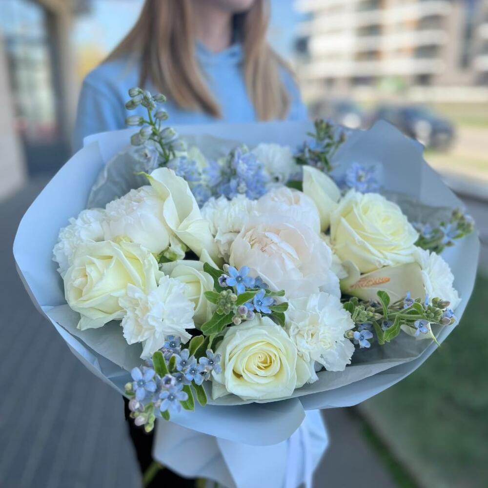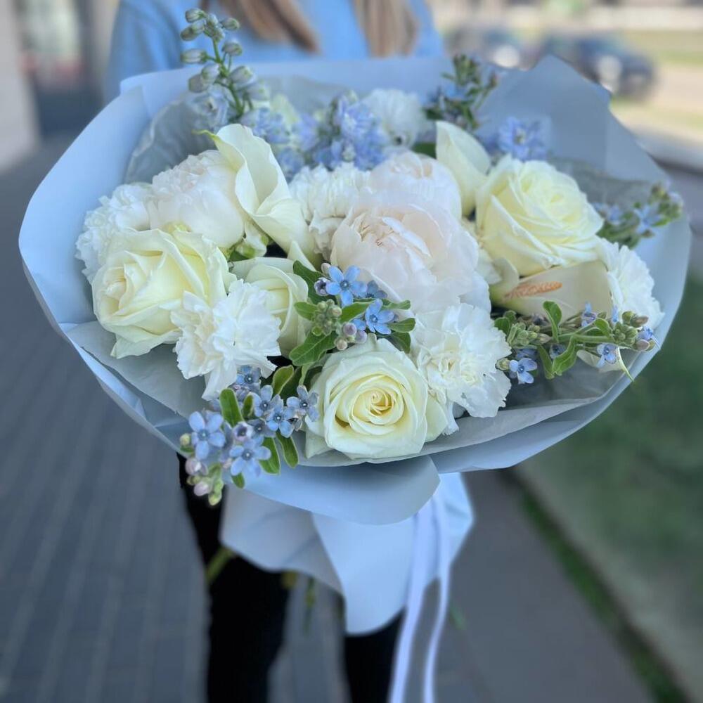 Peony - 3 pcs carnation - 6 pcs oxypetalum - 6 pcs delphinium - 3 pcs rose white - 4 pcs