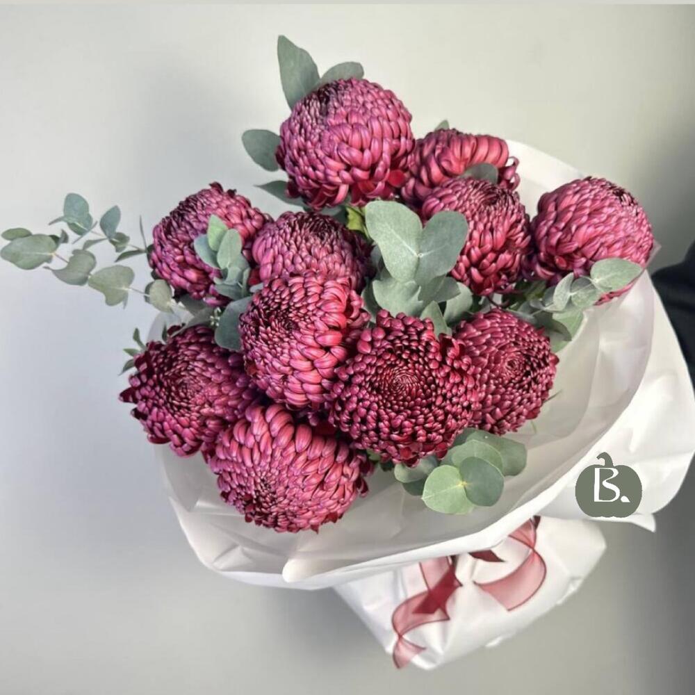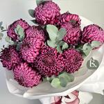 фу Объемный и стильный букет из редких хризантем сорта «Бигуди» в насыщенном фиолетовом оттенке. Каждый бутон — как маленькое произведение искусства: плотные лепестки, выразительная форма и невероятная стойкость. Такой букет идеально подойдет для тех, кто любит оригинальные цветы и современные композиции.