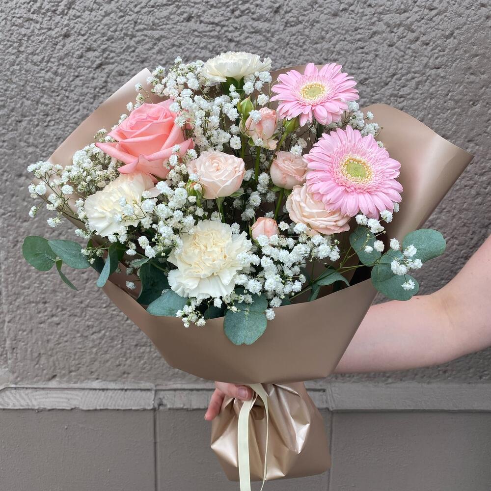 Gerbera - 2 pcs baby's breath flowers - 1 pcs rose - 1 pcs eucalyptus - 1 pcs spray rose - 1 pcs carnation - 3 pcs hypericum - 1 pcs