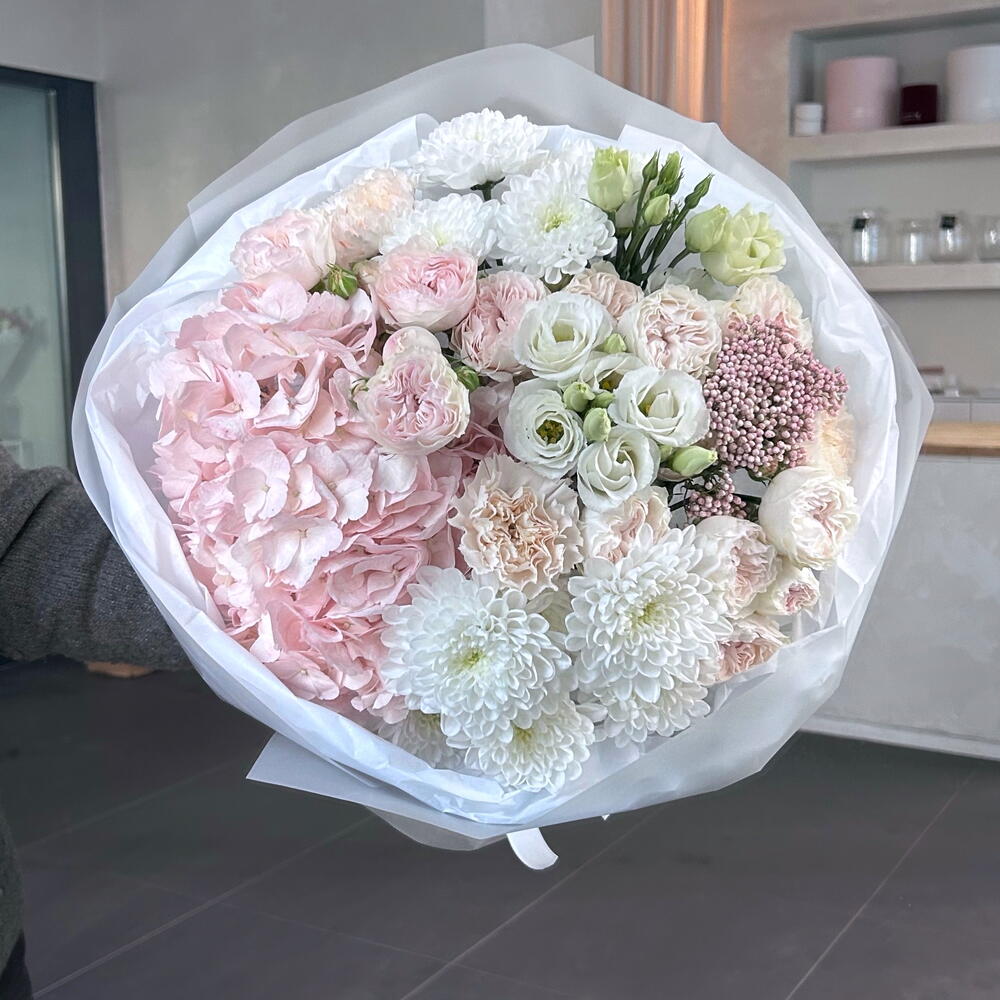Eustoma - 2 pcs Spray rose - 3 pcs Hydrangea - 1 pcs ozothamnus - 1 pcs carnation - 3 pcs chrysanthemum - 2 pcs