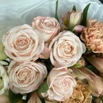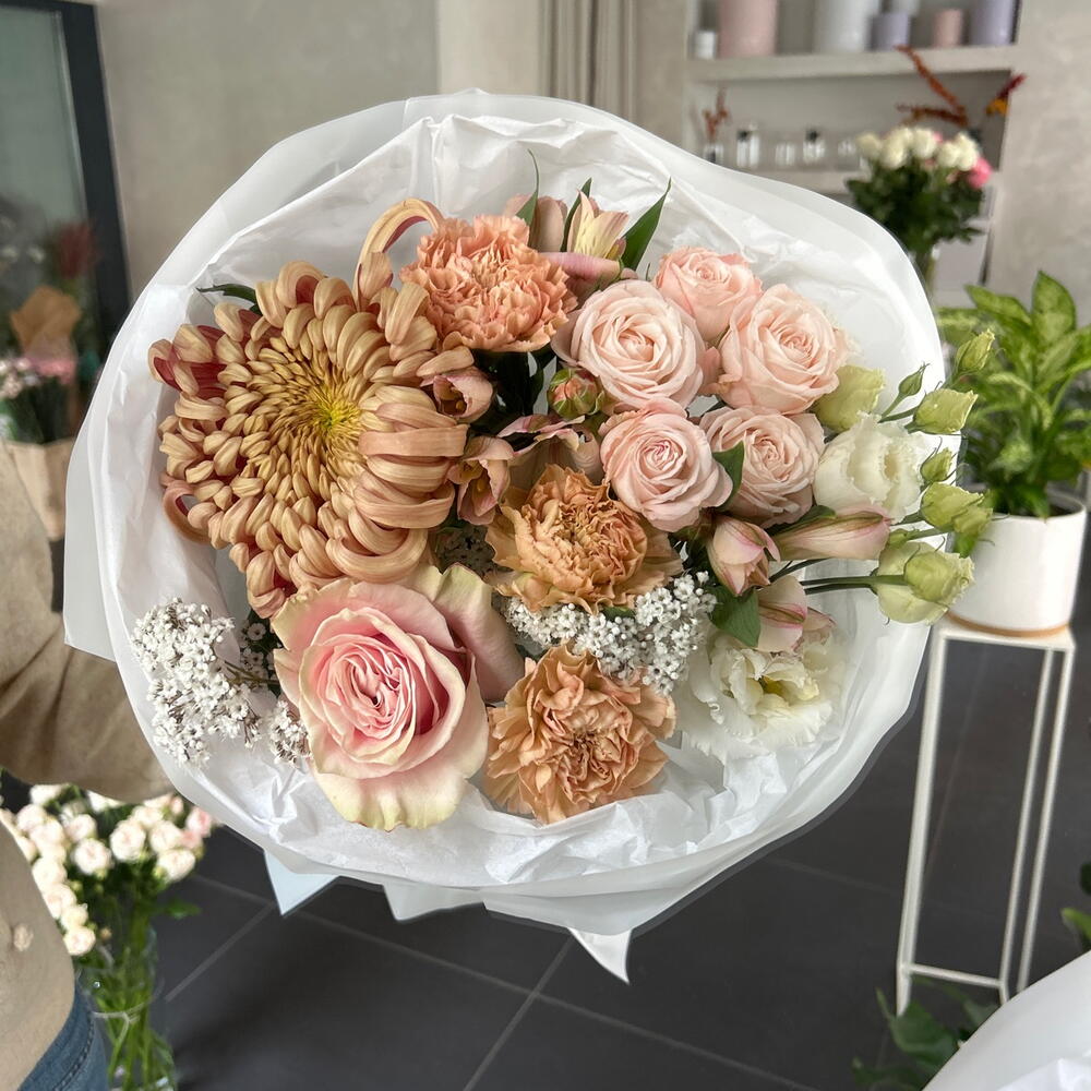 Eustoma - 1 pcs Alstroemeria - 1 pcs rose - 1 pcs spray rose - 1 pcs carnation - 3 pcs chrysanthemum - 1 pcs gypsophila - 1 pcs