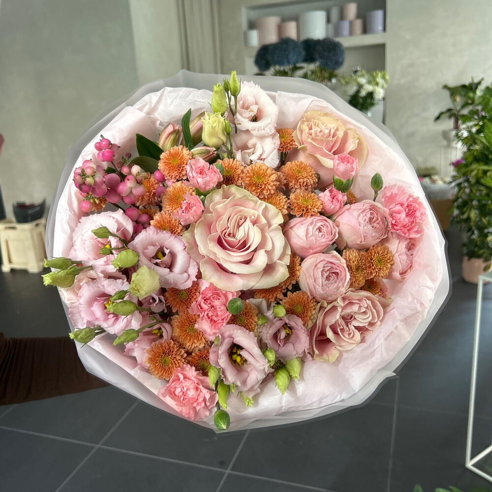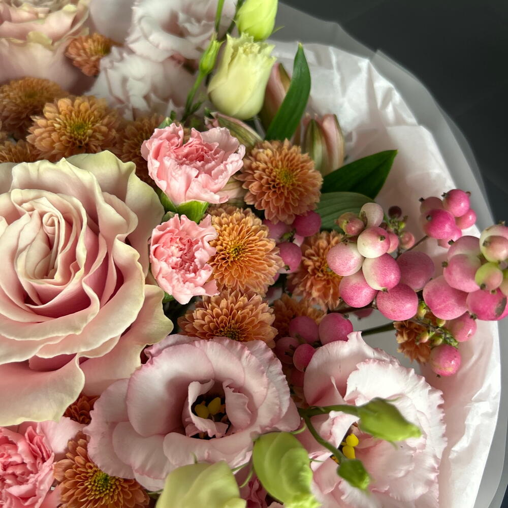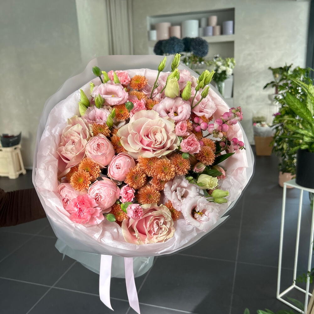 Eustoma - 3 pcs Alstroemeria - 1 pcs santini - 6 pcs rose - 3 pcs spray rose - 1 pcs spray carnation - 3 pcs snowberry - 1 pcs