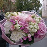 Eustoma white - 6 pcs carnations - 5 pcs chrysanthemum - 2 pcs flower accessories - 4 pcs hydrangea mix - 4 pcs
