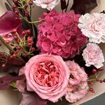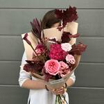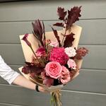 Leucadendron - 1 pcs Eustoma - 1 pcs Hydrangea - 1 pcs rose - 1 pcs calla - 2 pcs oak leaves - 3 pcs dianthus - 3 pcs rosehip - 1 pcs
