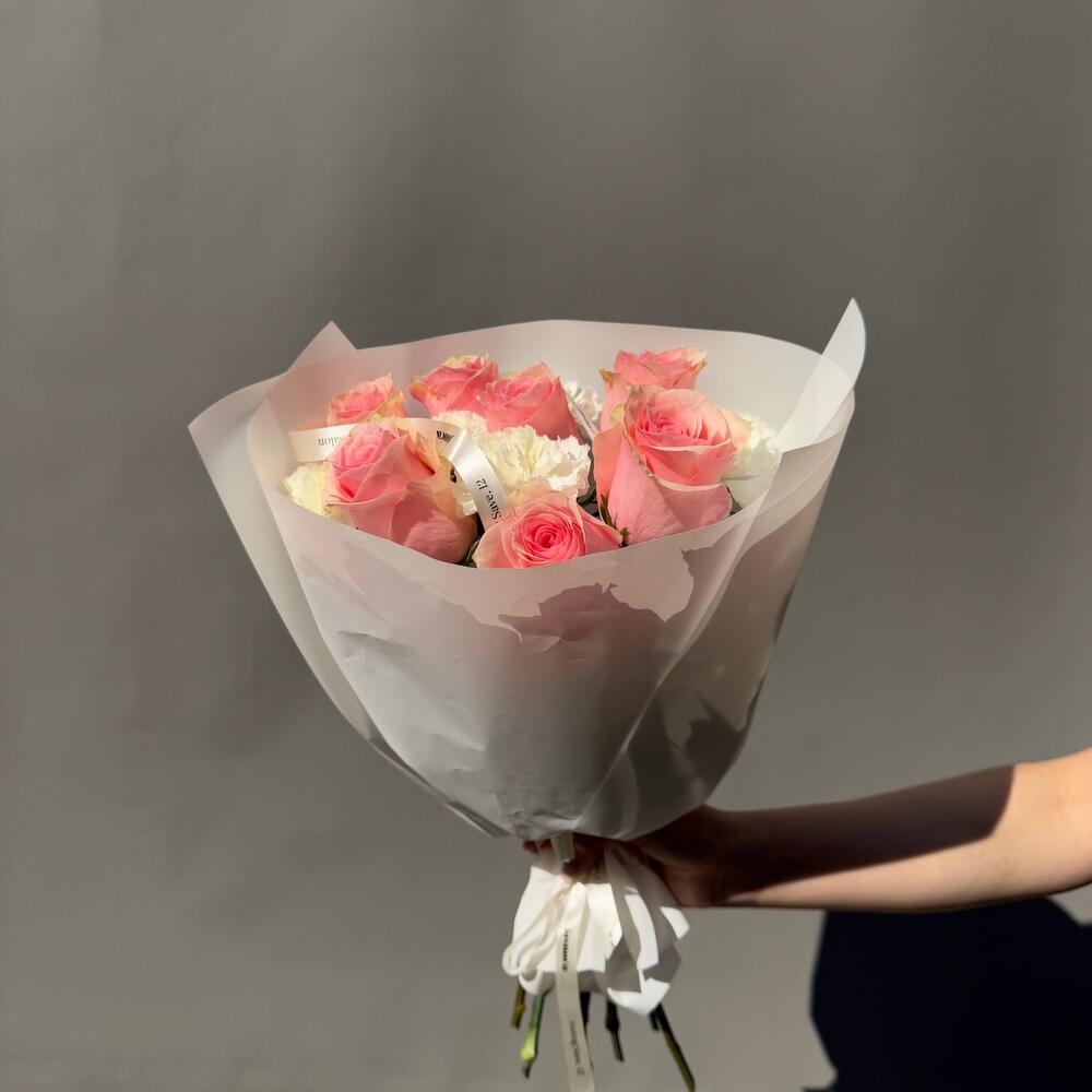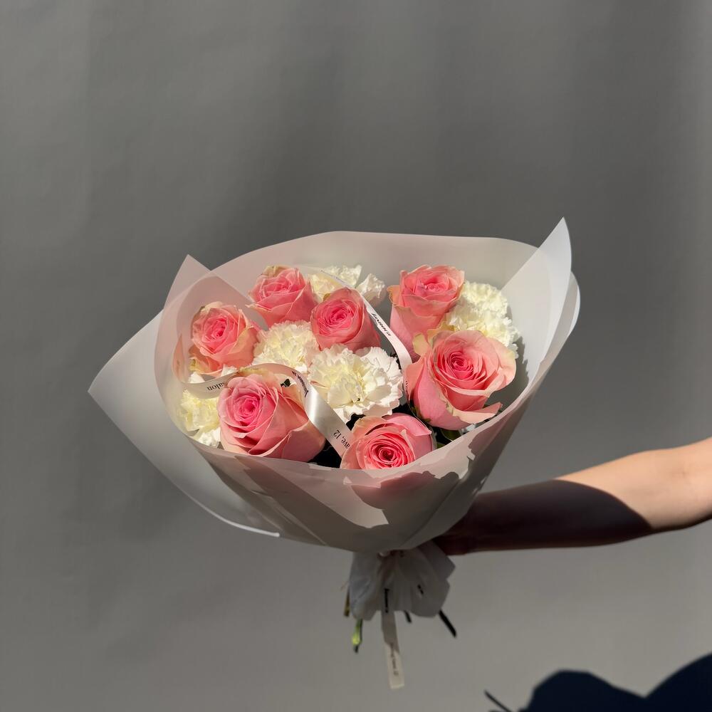 Beautiful duo bouquet featuring white dianthus and pink roses in size S. Perfect for any occasion. The shade of the roses may vary due to seasonal availability. Bouquet sizes are approximate. What you get: • A detailed care guide to help your flowers last longer • Flower food to preserve freshness up to 5-7 days • A gift bag for safe delivery